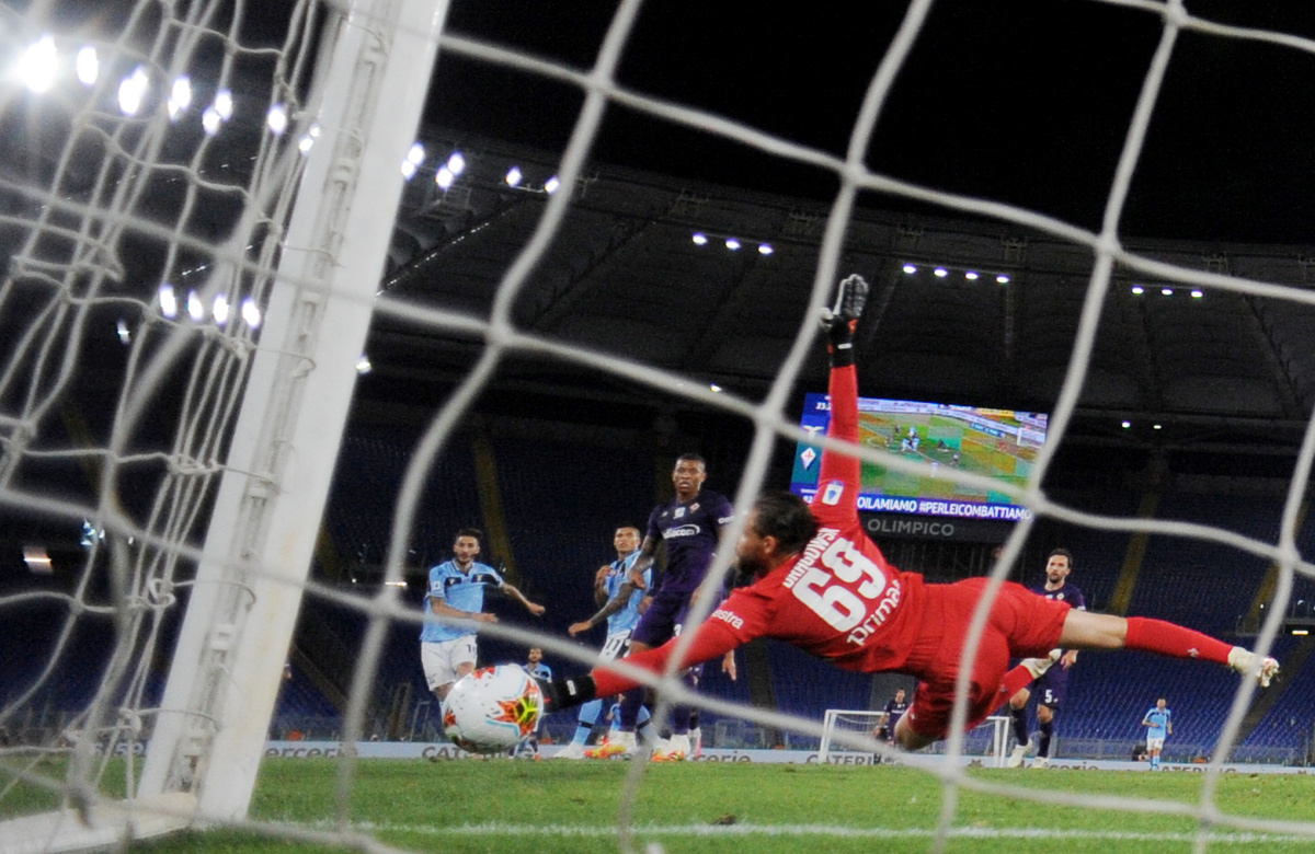 Soccer Football - Serie A - Lazio v Fiorentina - Stadio Olimpico, Rome, Italy - June 27, 2020 Lazio's Ciro Immobile scores their first goal, as play resumes behind closed doors following the outbreak of the coronavirus disease (COVID-19) REUTERS/Alberto Lingria