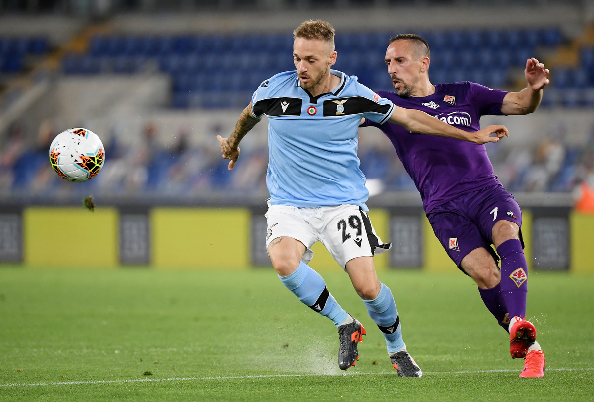 Soccer Football - Serie A - Lazio v Fiorentina - Stadio Olimpico, Rome, Italy - June 27, 2020 Fiorentina's Frank Ribery in action with Lazio's Manuel Lazzari, as play resumes behind closed doors following the outbreak of the coronavirus disease (COVID-19) REUTERS/Alberto Lingria