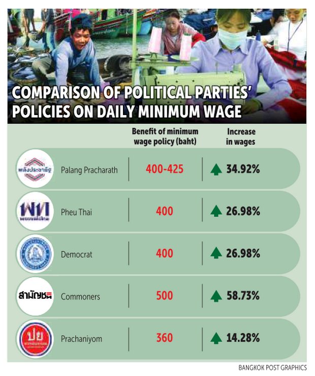 According to campaign policies for the daily minimum wage proposed by the Pheu Thai Party, the Palang Pracharath Party and the Democrat Party, the daily minimum wage would increase to 400-425 baht if they won the election and formed a new government.