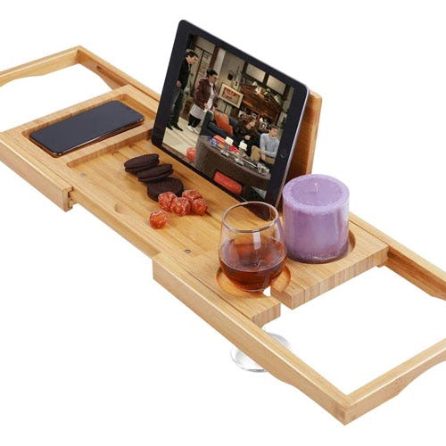 Ready for a bath? This bamboo bathtub tray turns what was once a necessary chore into an hour of self-care and indulgence. It holds your wine or cocktail glass, a candle, and a book so you can read your favorite novel while you soak. It expands to fit your tub, too.