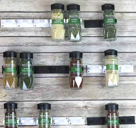 Turn the inside of a cabinet, the side of the fridge, a small bit of wall, or whatever surface is handy into a spice rack by simply mounting these gripper clips. Use the included adhesive tape to mount the grippers strips to the wall, and then snap the spice bottles you have into the clips. This pack comes with six strips of clips, which is enough to hold 30 spice jars. Note that the clips fit containers ranging from 1.5"-1.75" in diameter.