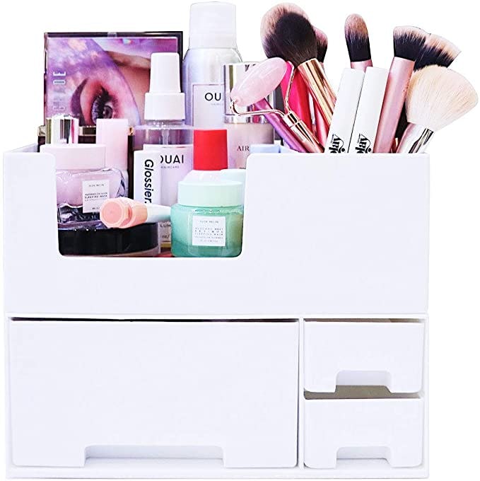 This compact organizer has a place for everything in your makeup and self-care kit. You can stack it or separate into two separate pieces, so it's easy to design the storage space you need to keep small things from turning into clutter. It has a few slots for brushes, three drawers, and a larger space for big and small items.