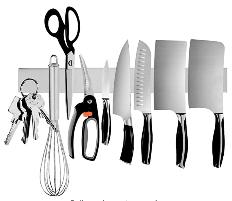 A wall-mounted utensil holder is by far the most convenient way to store kitchen knives and other metal kitchen tools. They'll be on display for easy access when you're cooking, and it'll be convenient to see each utensil and have it within an arm's reach at all times. When you wash a knife, just stick it back up onto the wall to air dry. You can also use this for keys, baking whisks, and other metal items.