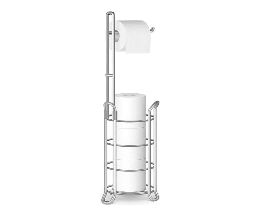 This toilet paper holder takes care of two problems at once: It provides a simple place where toilet paper can be reached without an actual wall-mounted roll holder, and it stores a few extra rolls of paper, too, so you don't have to restock the bathroom as often. It's also super sturdy, and is available in silver or bronze.