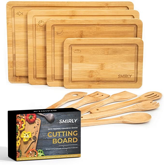 This set provides a quick kitchen upgrade with four matching bamboo cutting boards and six wooden utensils in one affordable package. The cutting boards have grooves around the edges to catch juices from fruits or meats, and each is labeled with an icon so you don't cut fresh fruit on the same board you used for raw meat. A varied collection of six matching cooking utensils comes with it, too.