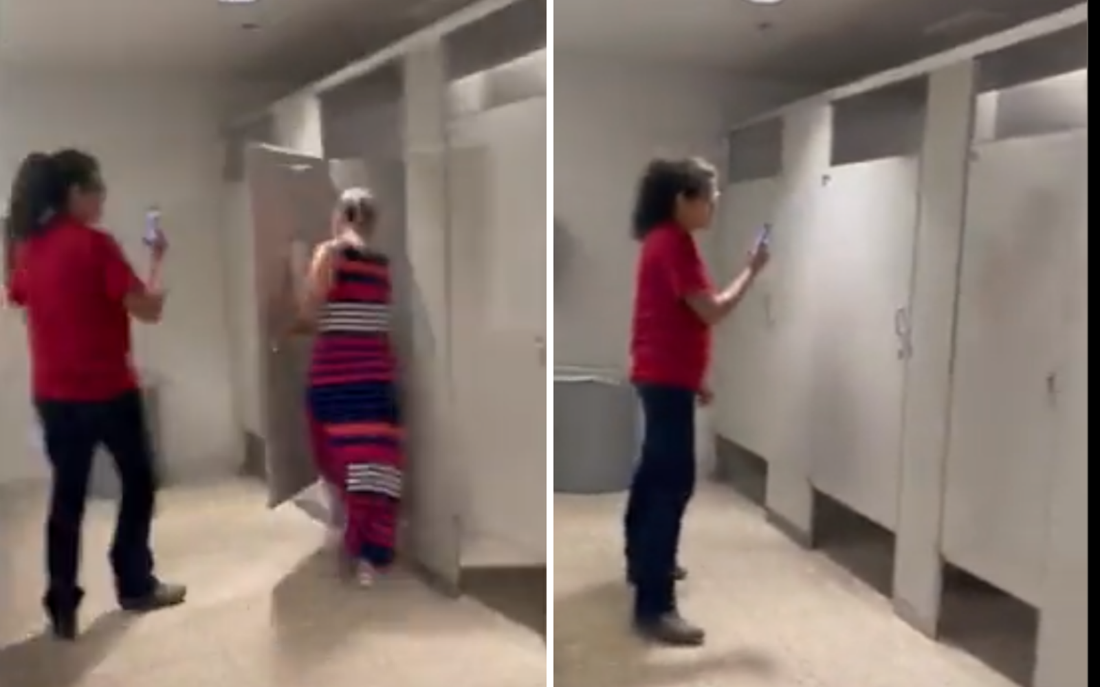 A controversial Democrat was heckled by protesters as she used the toilet at a university.