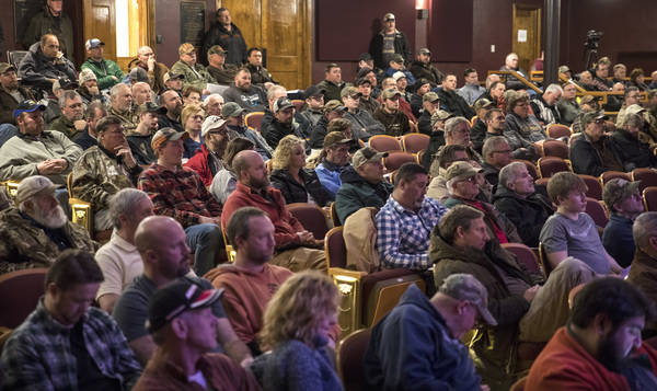 Potter Auditorium in Chatfield holds more than 550 people. A local police officer estimated the meeting turnout at 250, with many attendees leaving early. DNR officials and an assistant director of the state Board of Animal Health attended as part of the audience and didn't ask questions of Kroll and Shipley.
