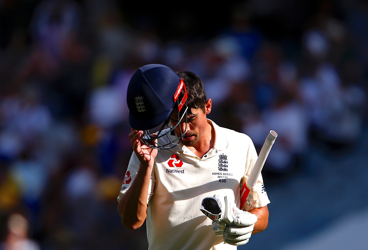 Cricket - Ashes test match - Australia v England - MCG, Melbourne, Australia, December 27, 2017. England's Alastair Cook takes off his helmet as he walks off the ground at the end of the second day of the fourth Ashes cricket test match. REUTERS/David Gray