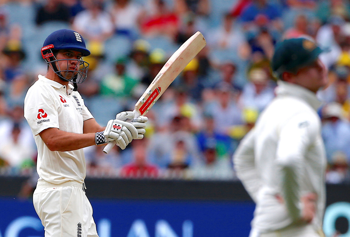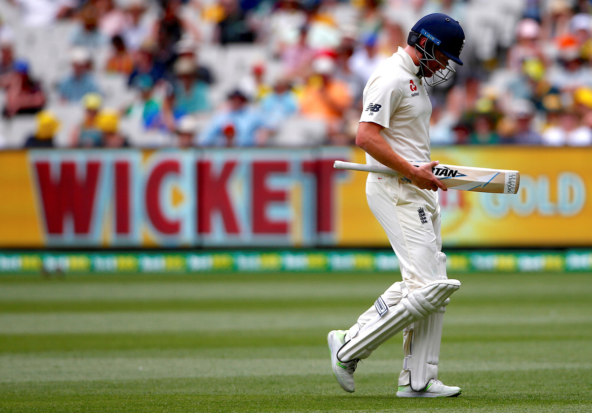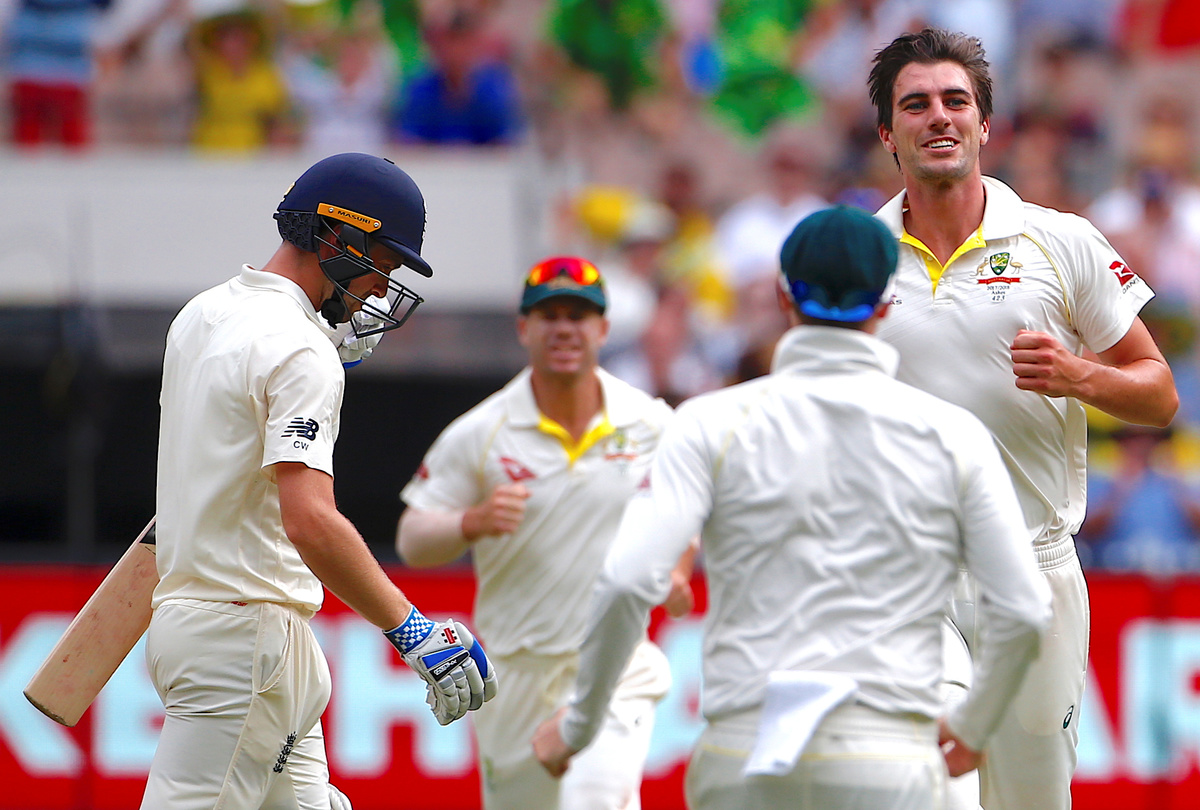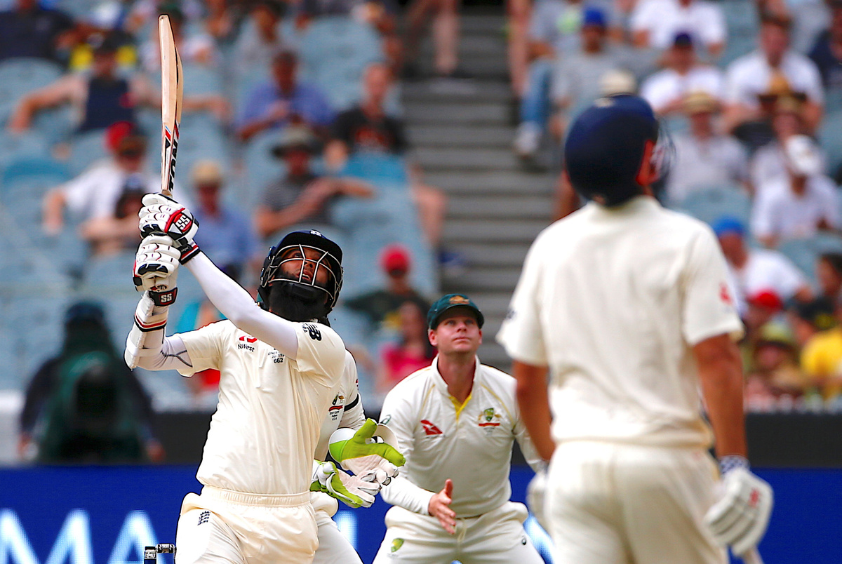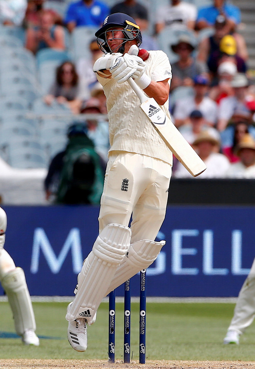 Cricket - Ashes test match - Australia v England - MCG, Melbourne, Australia, December 28, 2017. England's Stuart Broad is hit by a short delivery from Australia's Josh Hazlewood during the third day of the fourth Ashes cricket test match. REUTERS/David GrayCricket - Ashes test match - Australia v England - MCG, Melbourne, Australia, December 28, 2017. Australia's Pat Cummins celebrates after dismissing England's Chris Woakes during the third day of the fourth Ashes cricket test match. REUTERS/David GrayCricket - Ashes test match - Australia v England - MCG, Melbourne, Australia, December 28, 2017. England's Moeen Ali hits a six as team mate Alastair Cook and Australia's captain Steve Smith watch the ball during the third day of the fourth Ashes cricket test match. REUTERS/David GrayCricket - Ashes test match - Australia v England - MCG, Melbourne, Australia, December 28, 2017. England's Jonny Bairstow reacts as he walks off the ground after being dismissed during the third day of the fourth Ashes cricket test match. REUTERS/David GrayCricket - Ashes test match - Australia v England - MCG, Melbourne, Australia, December 28, 2017. England's Alastair Cook reacts with Australia's captain Steve Smith after hitting a boundary during the third day of the fourth Ashes cricket test match. REUTERS/David GrayCricket - Ashes test match - Australia v England - MCG, Melbourne, Australia, December 28, 2017. Australia's Josh Hazlewood reacts after a catch to dismiss England's Chris Woakes was not taken during the third day of the fourth Ashes cricket test match. REUTERS/David GrayCricket - Ashes test match - Australia v England - MCG, Melbourne, Australia, December 28, 2017. Australia's wicketkeeper Tim Paine reacts after missing a catch during the third day of the fourth Ashes cricket test match. REUTERS/David GrayCricket - Ashes test match - Australia v England - MCG, Melbourne, Australia, December 28, 2017. England's captain Joe Root reacts as he walks off the ground after being dismissed during the third day of the fourth Ashes cricket test match. REUTERS/David GrayCricket - Ashes test match - Australia v England - MCG, Melbourne, Australia, December 28, 2017. Australia's wicketkeeper Tim Paine prepares to take a catch to dismiss England's Jonny Bairstow during the third day of the fourth Ashes cricket test match. REUTERS/David Gray