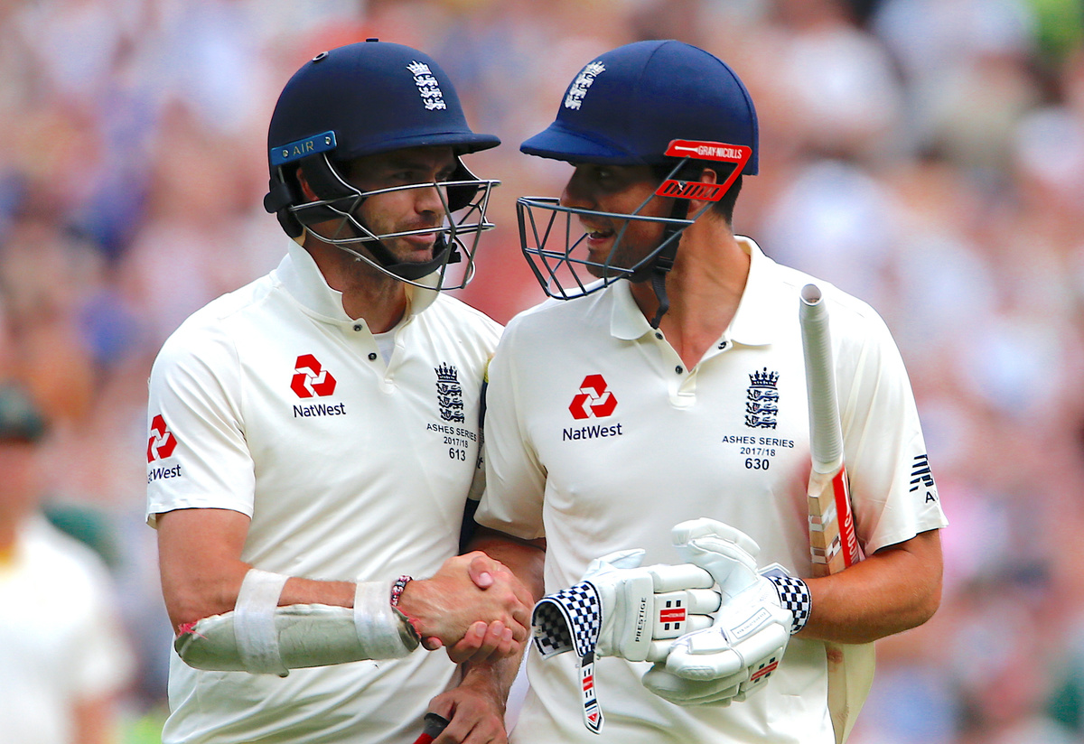 Cricket - Ashes test match - Australia v England - MCG, Melbourne, Australia, December 28, 2017. England's Alastair Cook shakes hands with team mate James Anderson as he walks off the ground at the end of the third day of the fourth Ashes cricket test match. REUTERS/David Gray