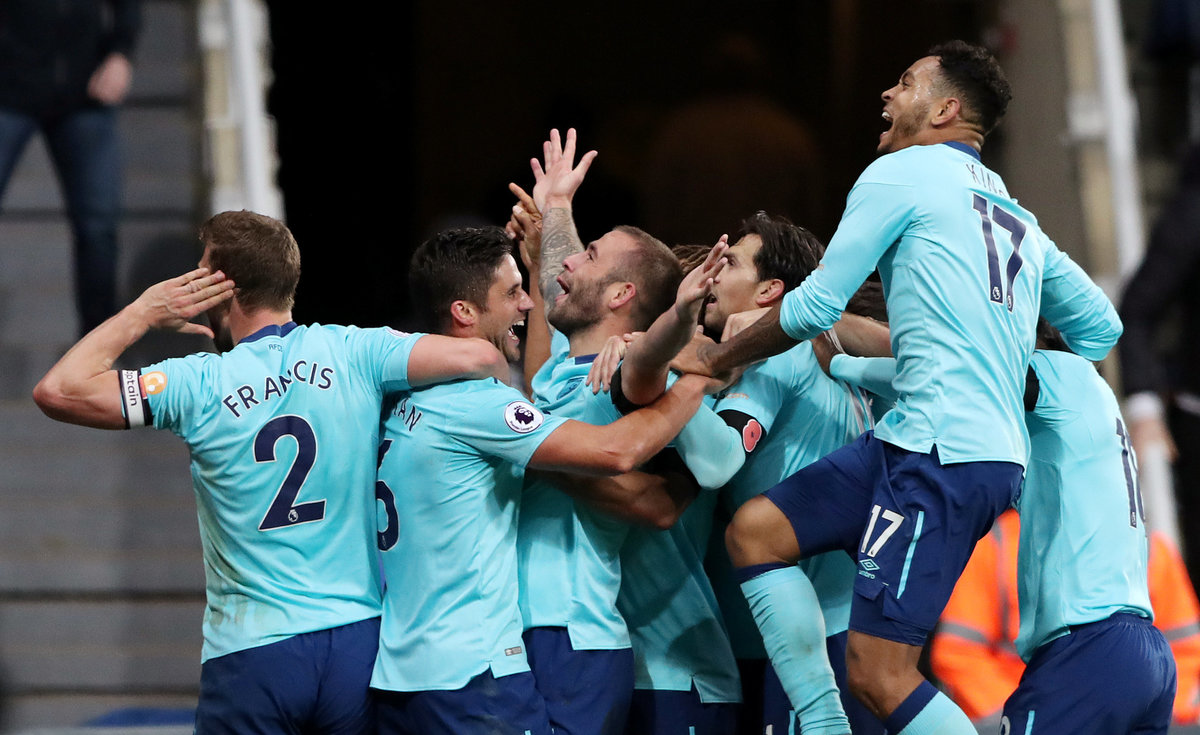 Soccer Football - Premier League - Newcastle United vs AFC Bournemouth - St James' Park, Newcastle, Britain - November 4, 2017 Bournemouth's Steve Cook celebrates scoring their first goal with team mates. REUTERS/Scott Heppell