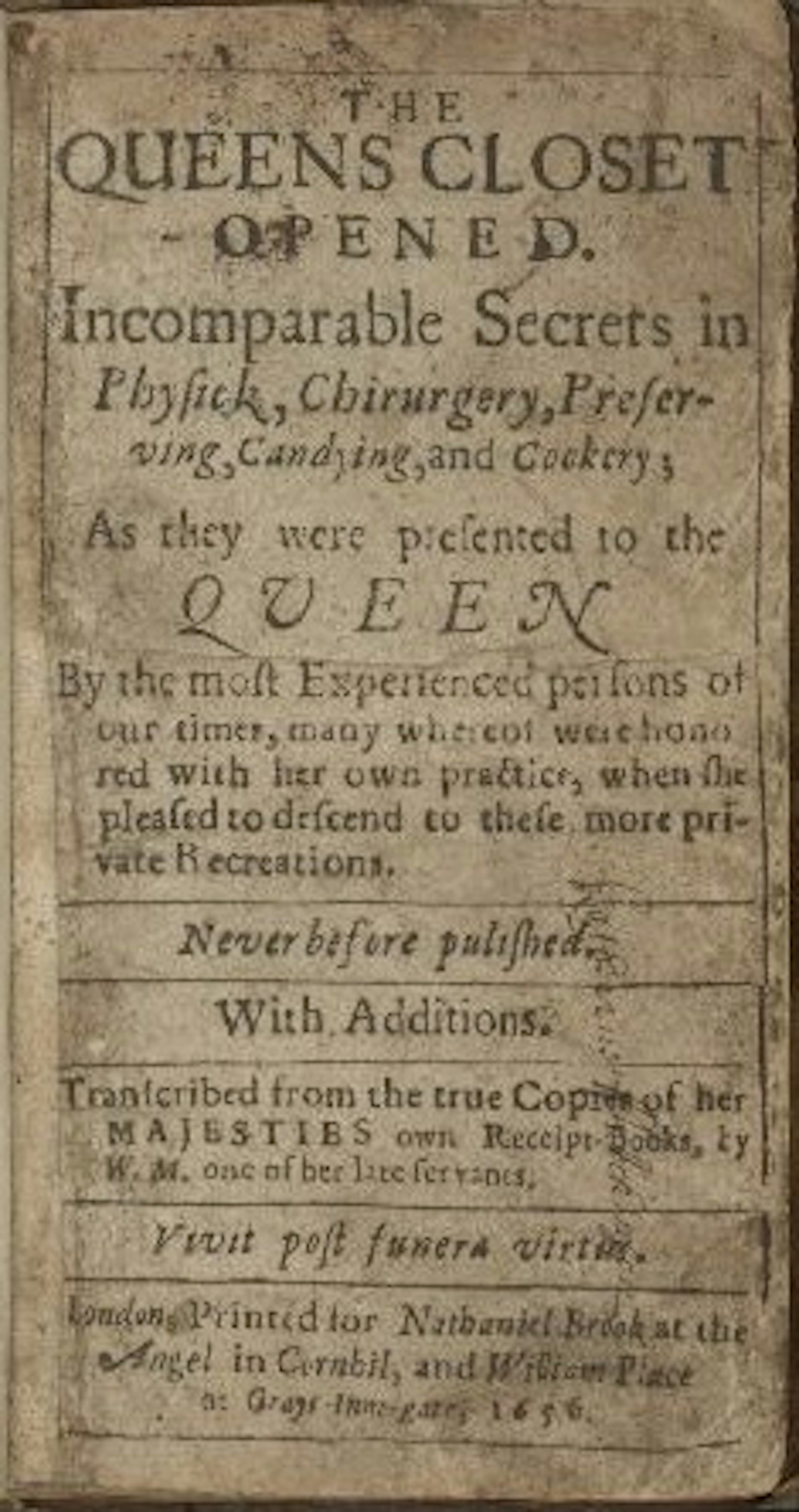 Two of the recipe books make direct reference to the former Royals. The Queens Closet Opened, first published in 1655, advertises itself as a collection from “the true Copies of her MAJESTIES own Receipt Books.” It’s a companion of sorts to the 1654 Art of Cookery Refin’d and Augmented, compiled by Joseph Cooper, “chiefe Cook to the Late KING.”