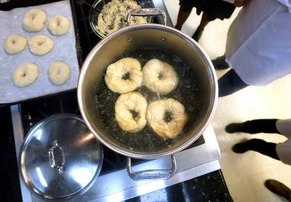 No fan of bagels she calls "as big as our heads," Kahn gave plenty of tips for making bagels that taste like bagels, instead of bread. For a fully developed flavor, she starts by making a sponge, which is a thin batter that begins to ferment before more flour is added.