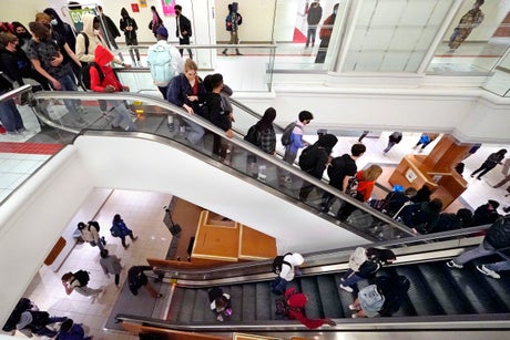 Students who once shopped at a downtown mall in Burlington Vermont, are now attending high school in the former Macy’s department store, with gleaming white tile floors and escalators whisking them to and from classes.