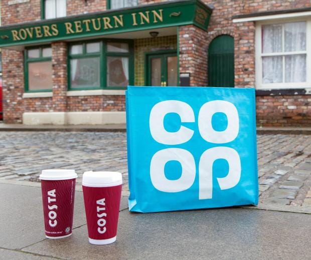 Co-op's and Costa Coffee's facades will be seen on the show, alongside branded posters, bags and cups used by Coronation Street characters.