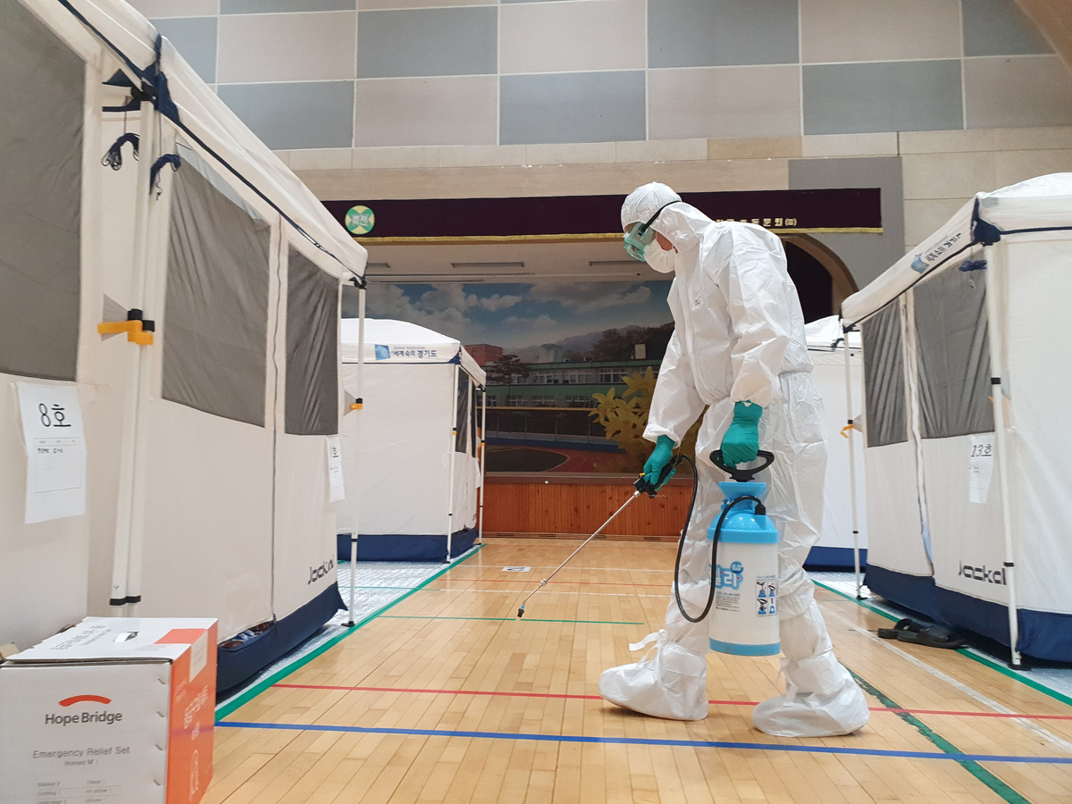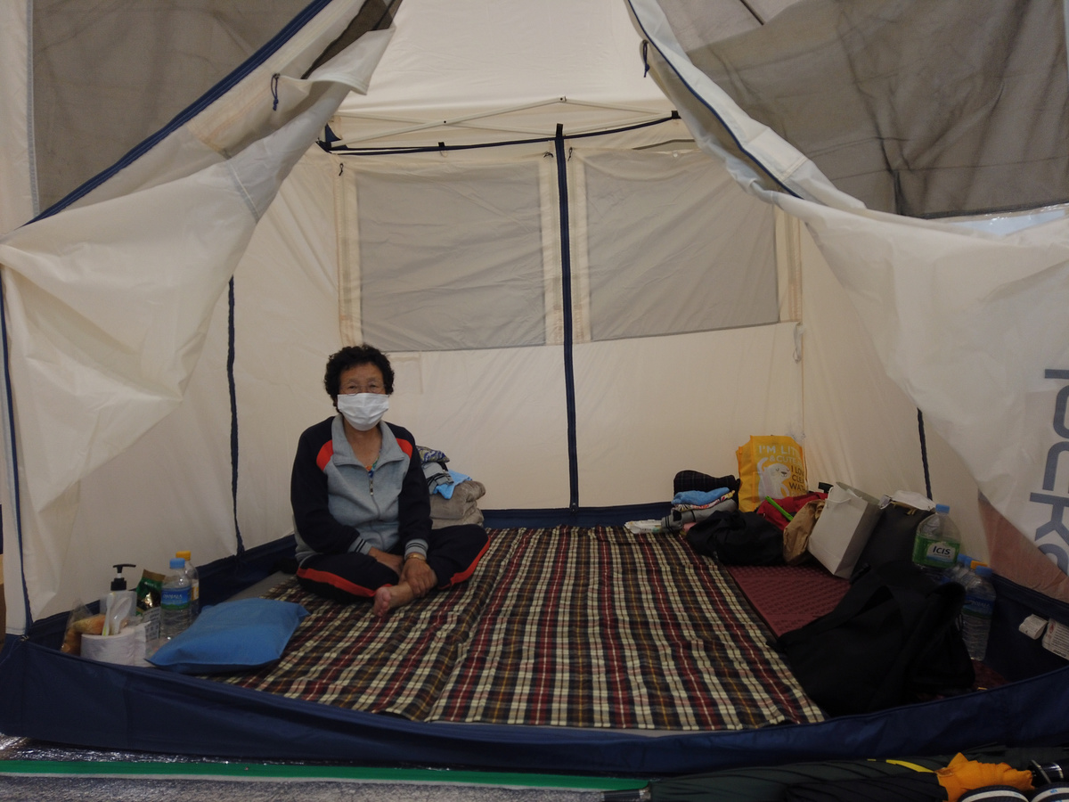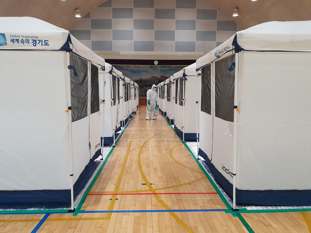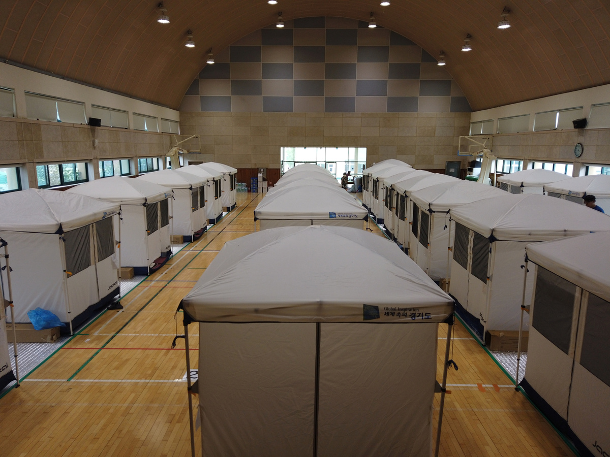 As a precaution against the shelters becoming coronavirus hotspots, officials at the school in Anseong, a city of 190,000 people 80 kilometres (50 miles) south of Seoul, erected tents and placed them slightly apart to encourage social distancing.