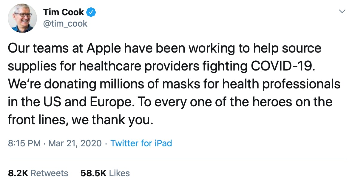 Musk isn't the only tech boss taking part in efforts. Facebook CEO Mark Zuckerberg stated Sunday that he has donated an emergency reserve of 720,000 masks to fight the virus, a reserve the firm built up in case the California wildfires continued. Apple CEO Tim Cook pledged that his company would deliver "millions" of masks in the United States and Europe.