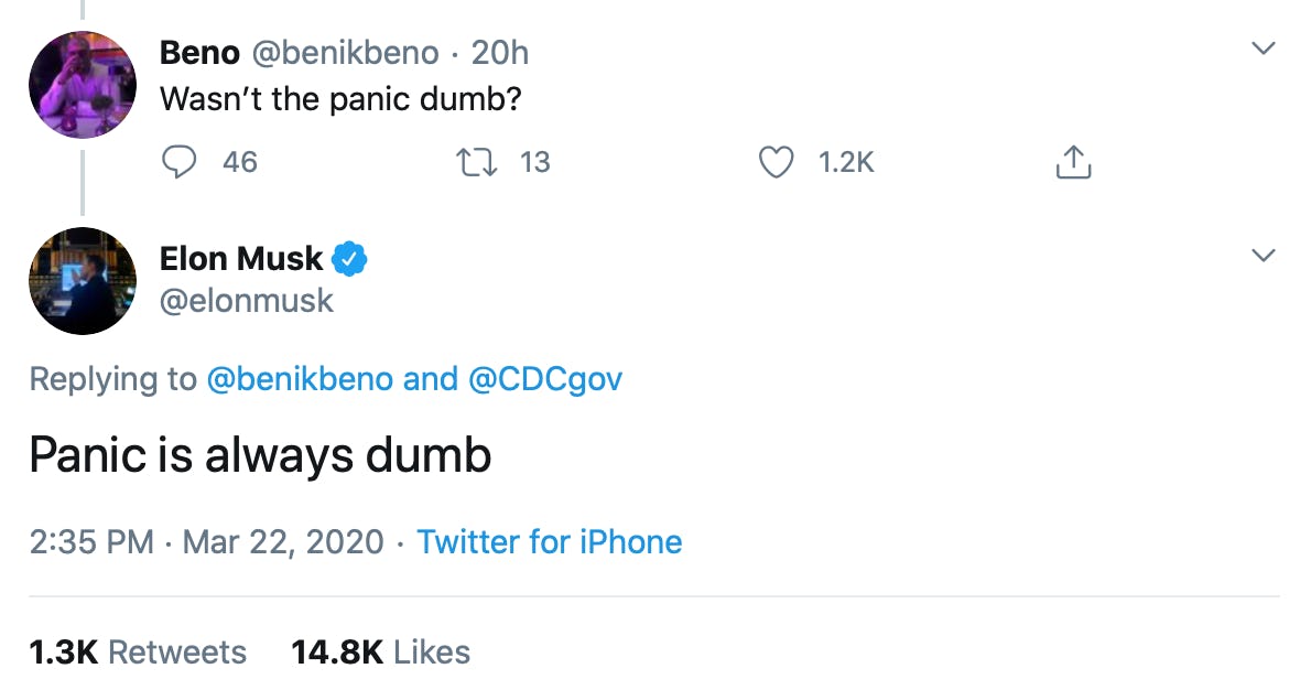 The company's Fremont facility closed Monday, after a long back-and-forth over whether the facility could remain open with a reduced workforce. When asked about his previous comments on describing the "panic" as "dumb," Musk replied that "panic is always dumb."