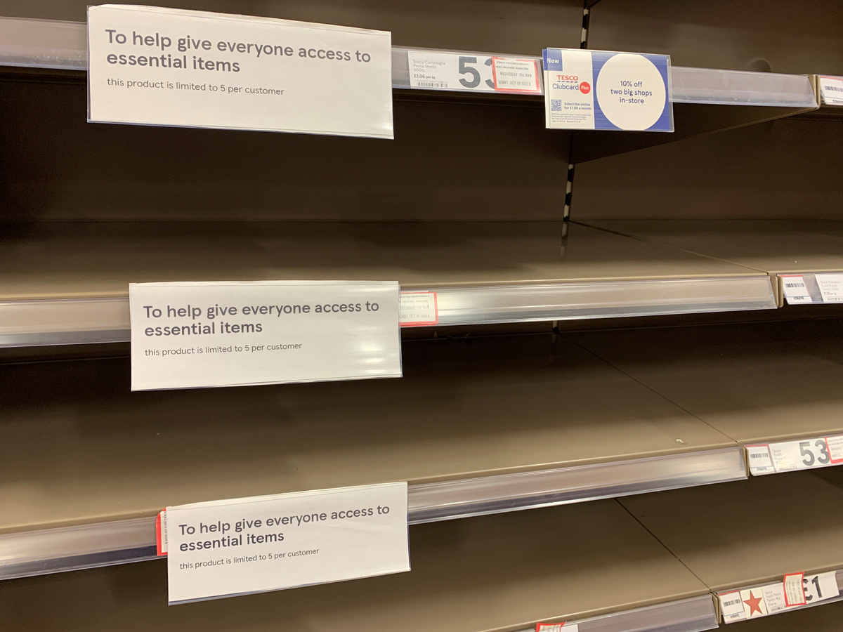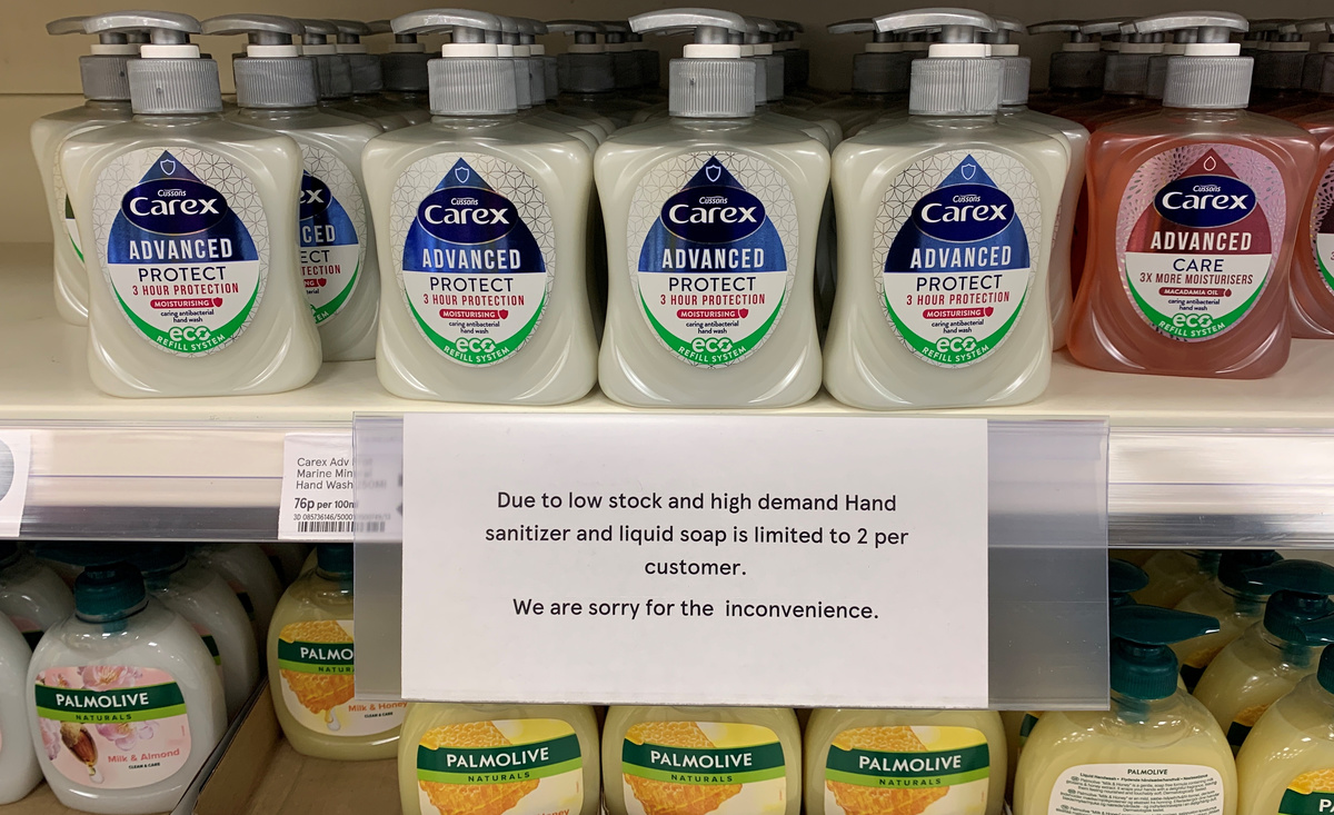 The country's biggest retailer, Tesco, has restricted bulk buying of products such as anti-bacterial gels and wipes, dried pasta and long-life milk.