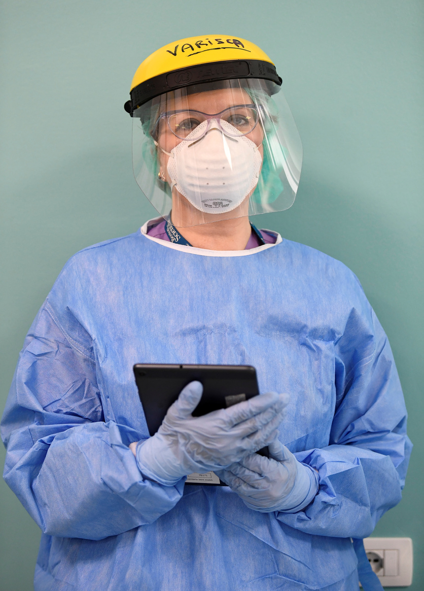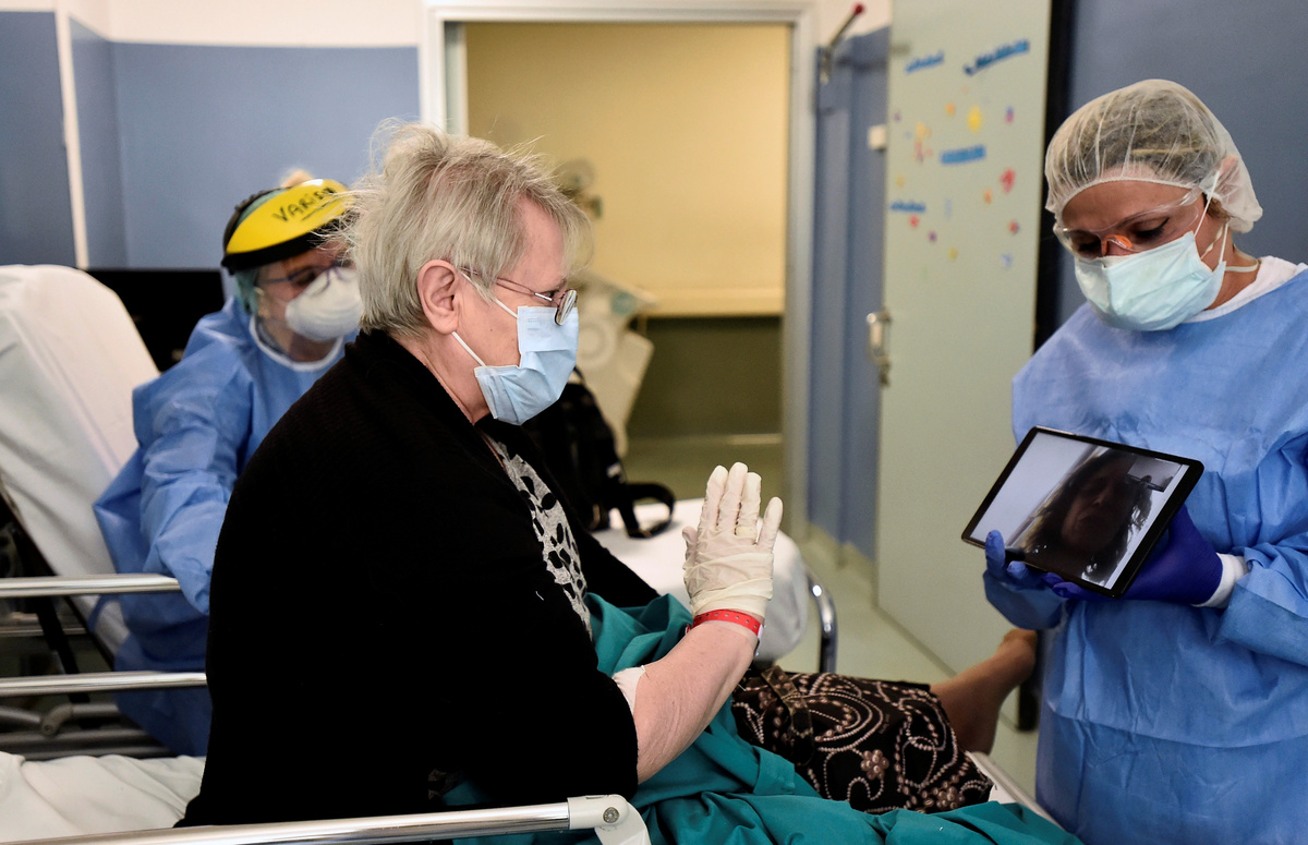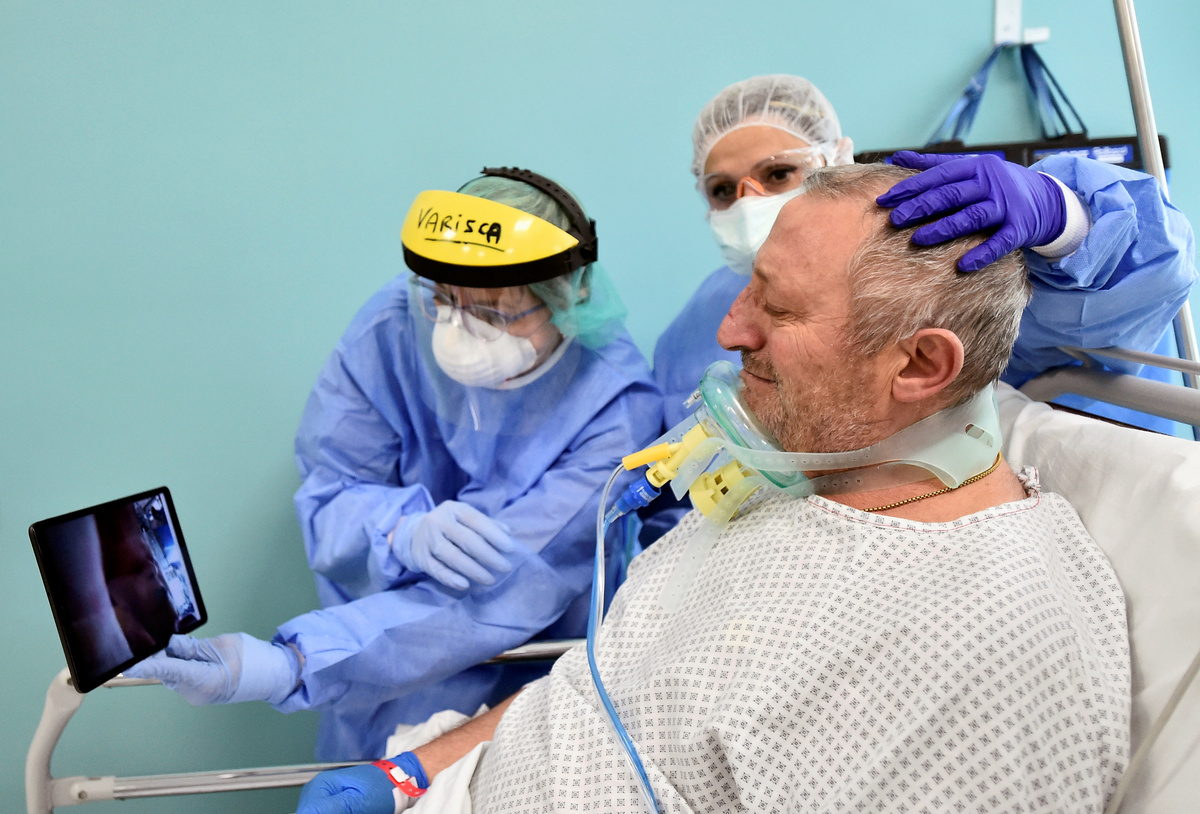 So, Zambon and his colleagues are using tablets donated by the city and private citizens to ease the pain of distance and loneliness. Most of the patients are elderly and do not know how to use the tablets, so hospital staff make the calls and hold them up to their faces.