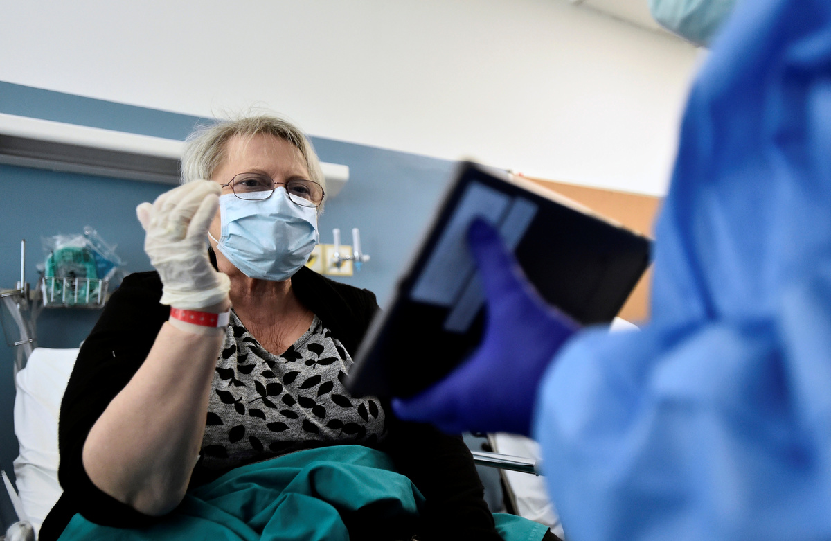 A patient suffering from the coronavirus disease (COVID-19) uses a tablet to speak to a relative who is unable to visit, at the Cernusco sul Naviglio hospital in Milan, Italy, April 7, 2020. REUTERS/Flavio Lo Scalzo