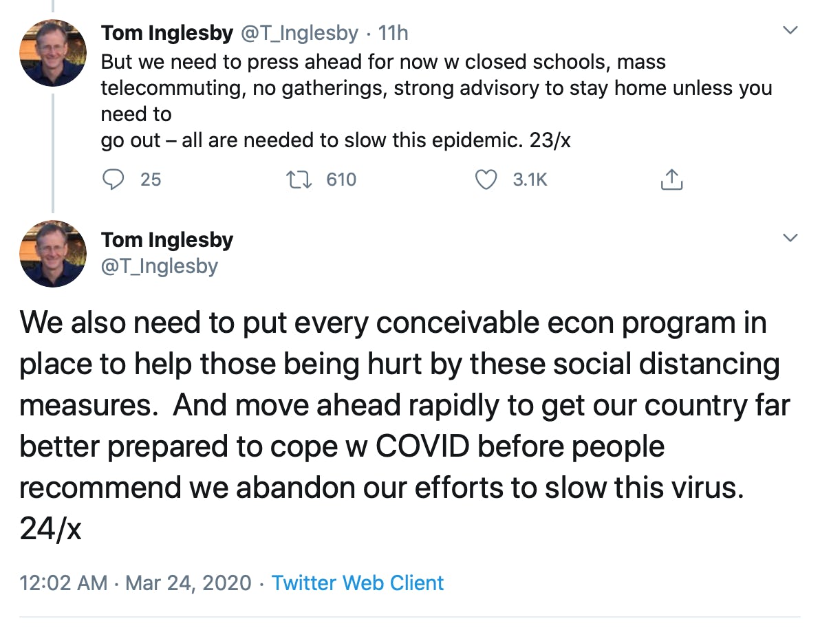 But instead of suggesting the country could reconsider its position, Ingelsby warned that current understanding is still developing. Ingelsby's thread was aimed at scrutinizing claims from "prominent US voices" that call for an end to social distancing, "citing rationale that they're worse than impact of COVID itself." He wrote that "COVID has been spreading w/ exponential growth in US for some time, and we're just beginning to get an understanding of how extensively."
