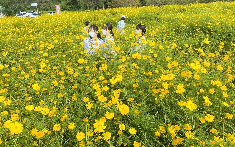 The early-blooming cosmos are currently blossoming, and as the season progresses, a total of 400,000 cosmos consisting of four varieties will bloom, according to a nonprofit organization that manages the flower garden. The garden also features a maze made of golden cosmos.