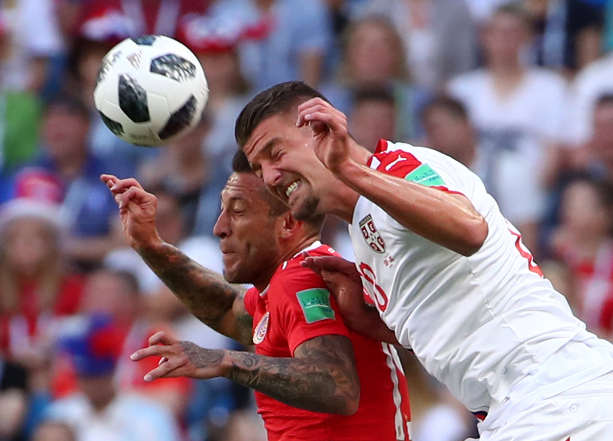 Soccer Football - World Cup - Group E - Costa Rica vs Serbia - Samara Arena, Samara, Russia - June 17, 2018 Serbia's Sergej Milinkovic-Savic heads the ball clear as Costa Rica's Oscar Duarte challenges REUTERS/Michael Dalder