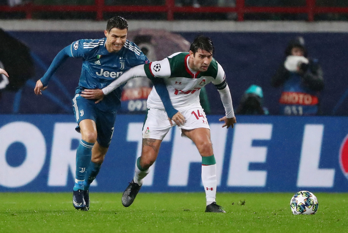 Soccer Football - Champions League - Group D - Lokomotiv Moscow v Juventus - RZD Arena, Moscow, Russia - November 6, 2019 Juventus' Cristiano Ronaldo in action with Lokomotiv Moscow's Maciej Rybus REUTERS/Evgenia Novozhenina