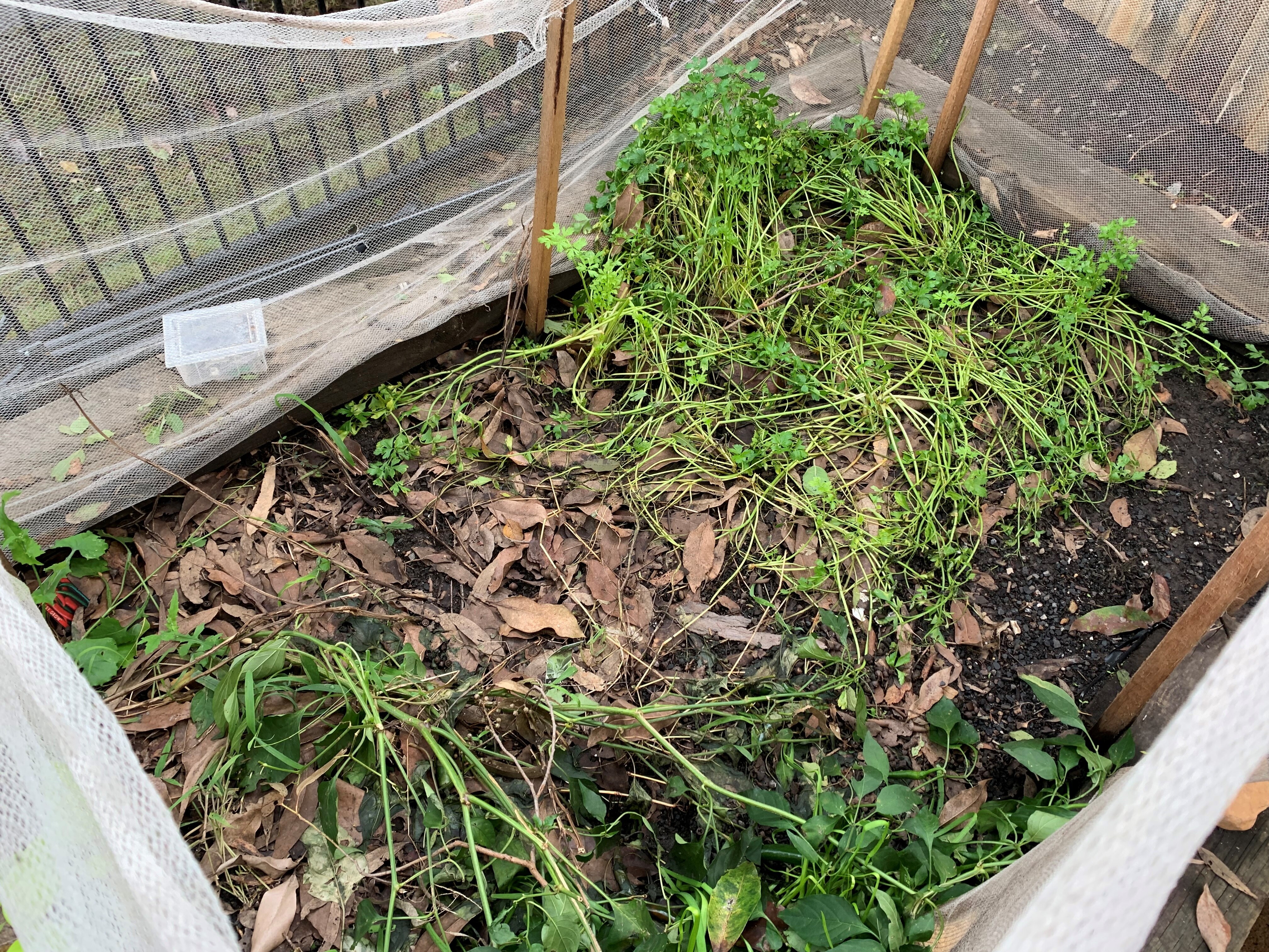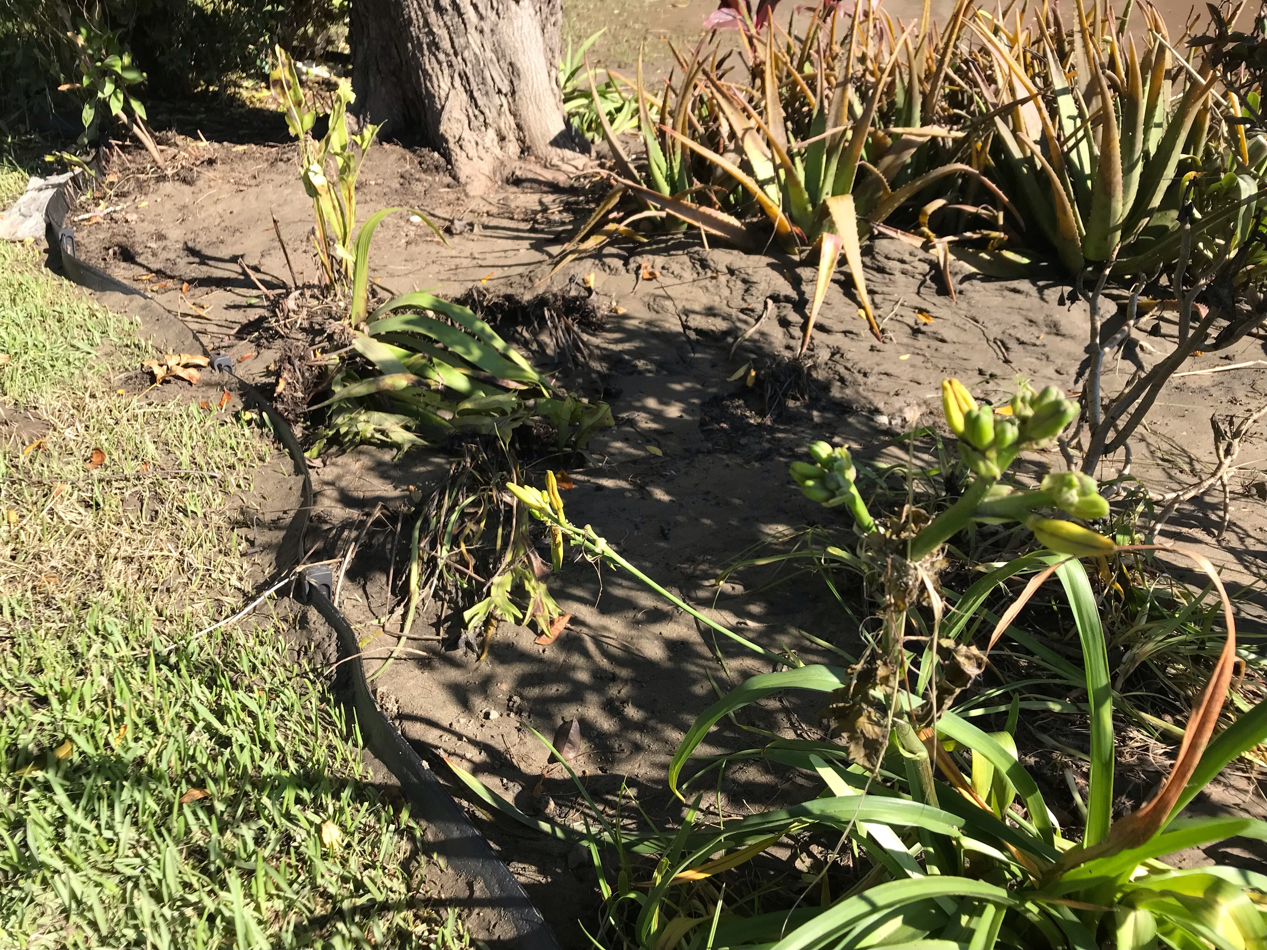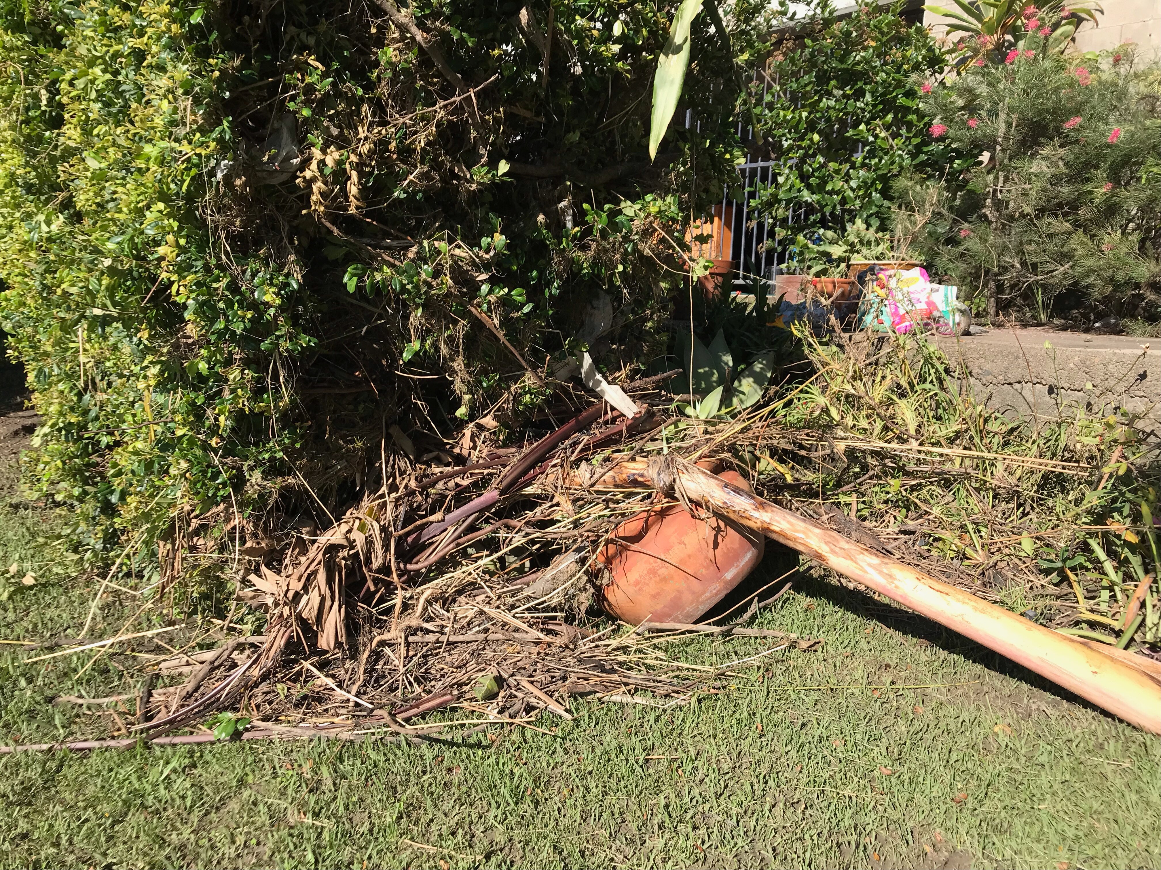 The now receded floodwater left behind a thick sludge of mud covering the garden, and collapsed vegetation.