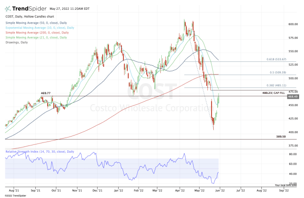 Last week, Costco stock made a sharp break lower, leaving an unfilled gap at $480.23. The stock filled part of that gap yesterday and a bit more of it today.