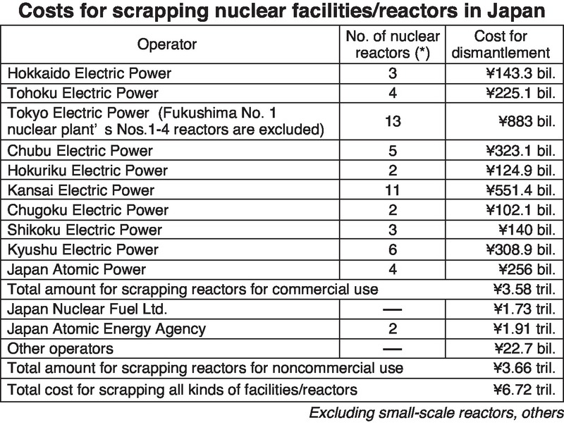 The total cost for scrapping the nation's nuclear power facilities -- excluding Fukushima No. 1 nuclear power plants and other facilities under construction -- is estimated to be about 6.72 trillion yen, according to a tally by The Yomiuri Shimbun.