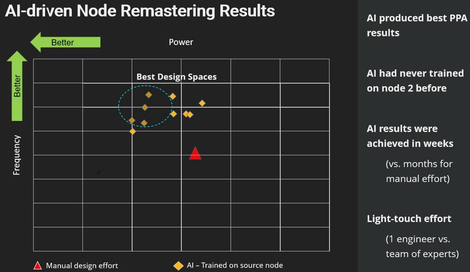 In the example above, Synopsys is illustrating an actual customer design, where the red triangle represents a manual design effort of a team of human engineers. As you can see, the clock speed (Frequency) and power characteristics are significantly less optimal than the diamond targets achieved by the AI trained on an original source manufacturing node. Synopsys could then achieve even better performance and power characteristics as well, after training the AI with that same design on a more advanced chip fab process that has inherently better characteristics for speed and power efficiency.