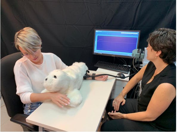 The robot, called PARO, is a plush stuffed seal robot that moves and makes objectively adorable cooing sounds in response to touch and sound. (Sidenote: PARO is the robot’s legal name, but no one needs to be yelled at right now, so henceforth I will refer to it as Paro.) Paro is not exactly new — it has been used to help elderly patients, especially those with neurodegenerative conditions, reduce stress since 2003 — but a small new study released last week suggests that it may also help younger people who need some physical contact. The study, published in the journal Scientific Reports, introduced 63 20-somethings to Paro for an hour-long session. Twenty additional participants did not get to play with Paro and were used as a control group.