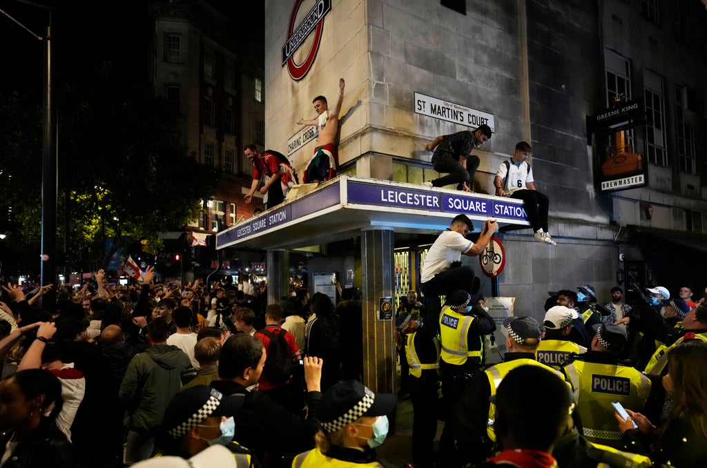 People clambered on top of London buses, while others opted to stand on the roofing of the subway station at Leicester Square. It was one of those nights.