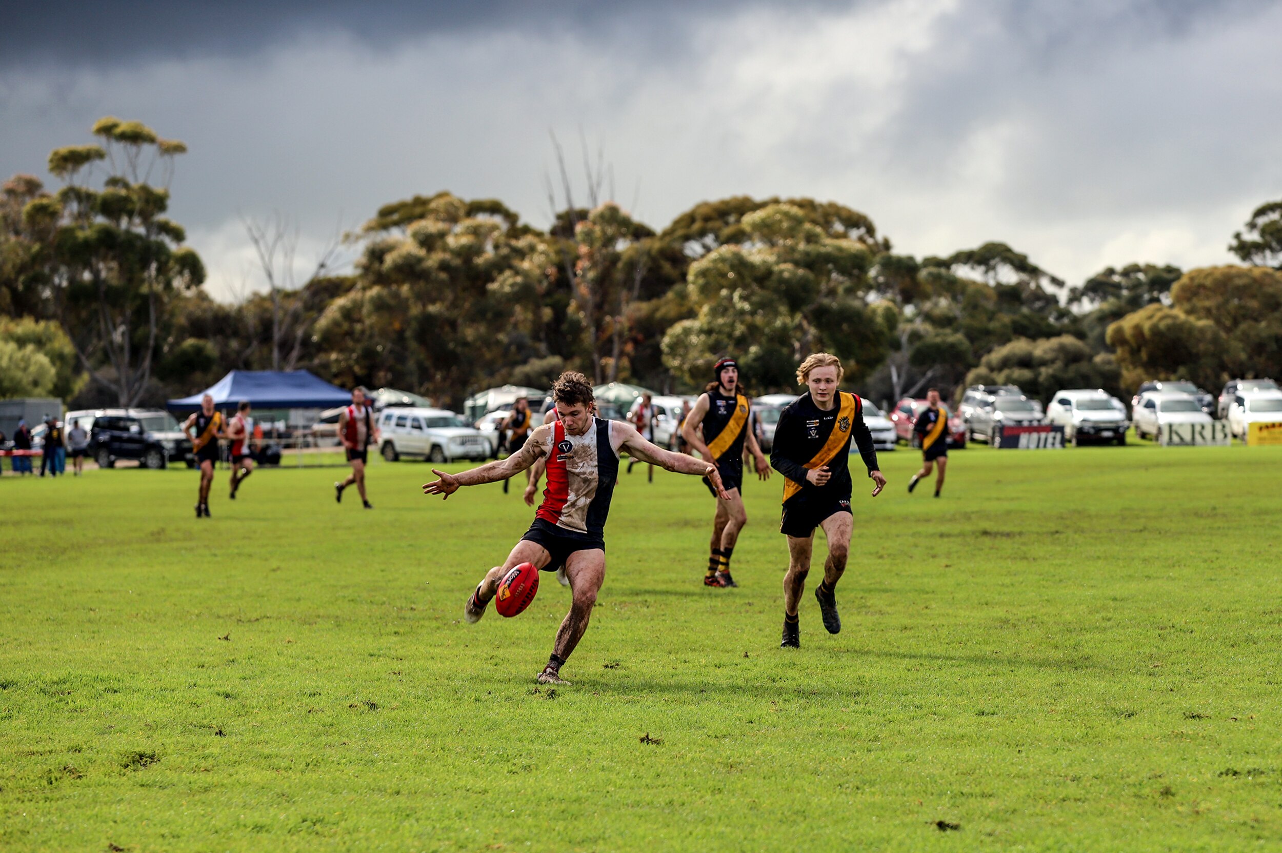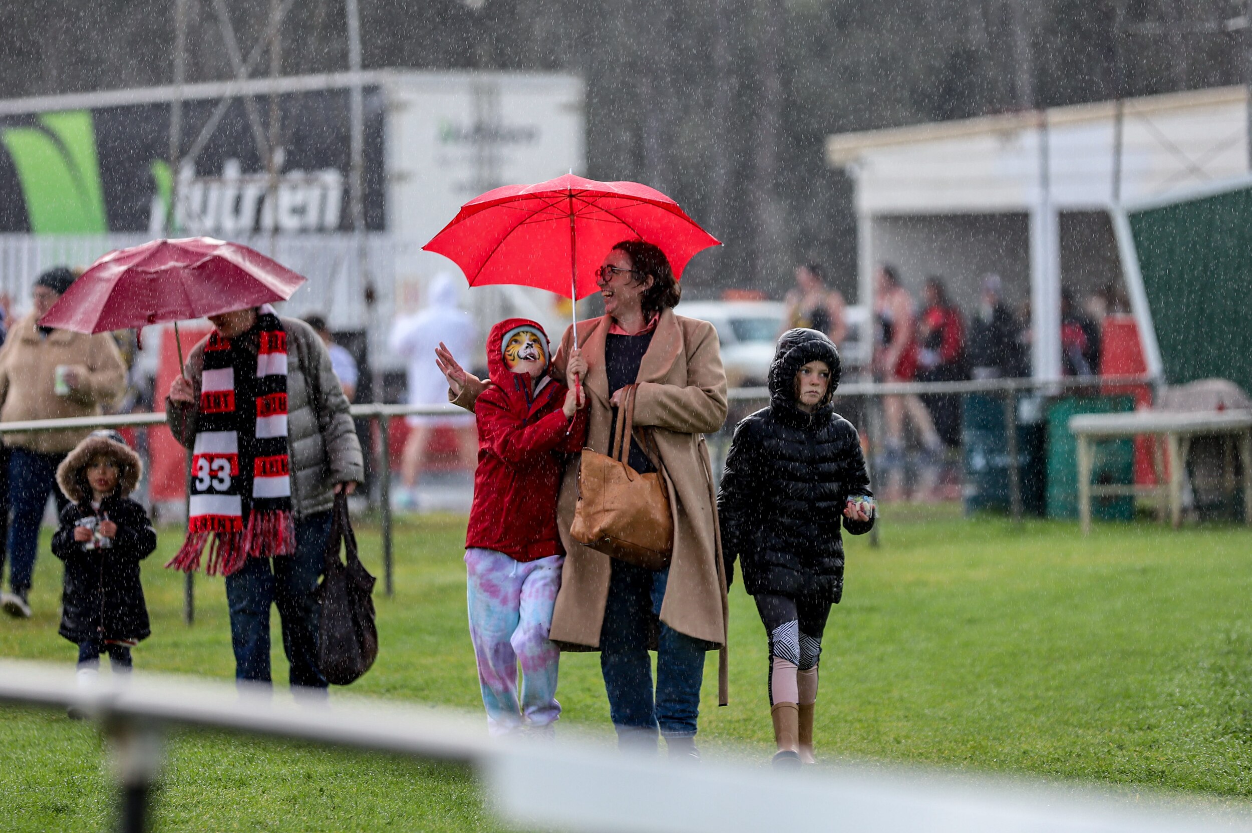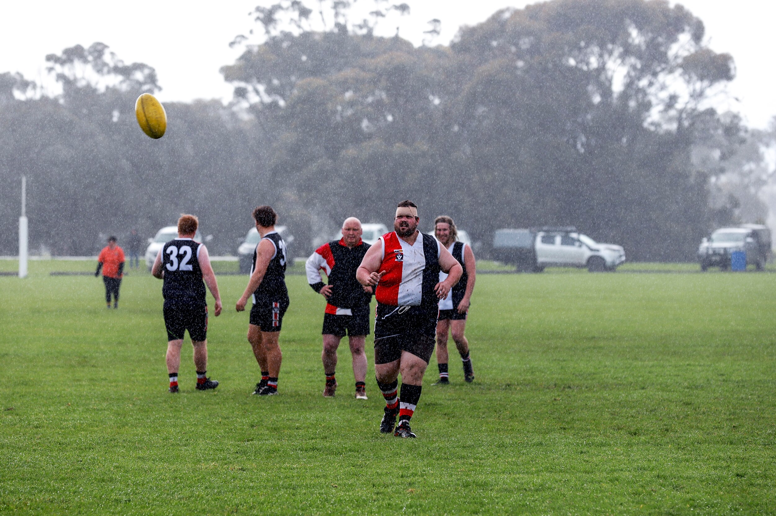 By the time the seniors footy team finally took to the field, the ground was saturated from lashings of afternoon rain.