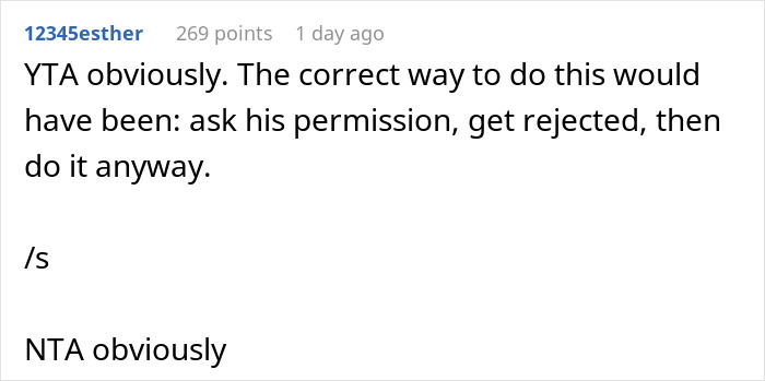 And in any of our posts dedicated to such stories, none of the newlyweds were happy about such an announcement. N. O. N. E. So the commenters are almost sure that the original poster simply took good revenge on his treacherous bro. “What goes around comes around,” one commenter claimed. However, some are sure that this was not the perfect revenge. “The correct way to do this would have been: ask his permission, get rejected, then do it anyway,” another person added wittily.