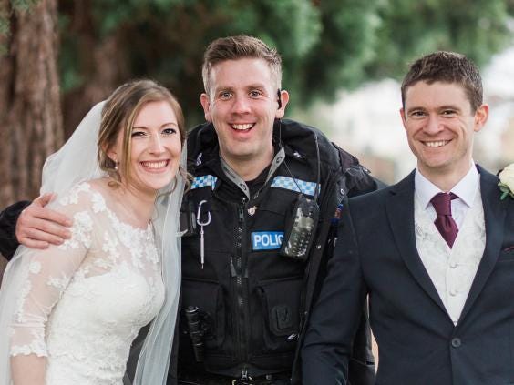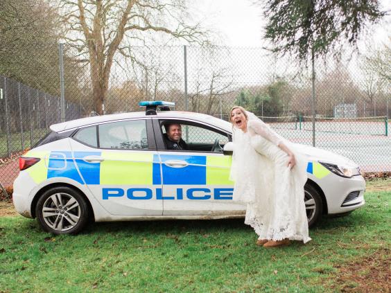 Speaking to The Independent, Ms Crossman, said: “It happened two minutes into the photoshoot. The police instructed us to get off the main path, as a drugs chase was happening. It was surreal. We saw the man running past as he was being chased by the police. At first we were scared. But, once we realised it was safe it became actually quite funny. Even Mr and Mrs Eye began to laugh and took photos with the police once it was all over. It was fun to watch.”