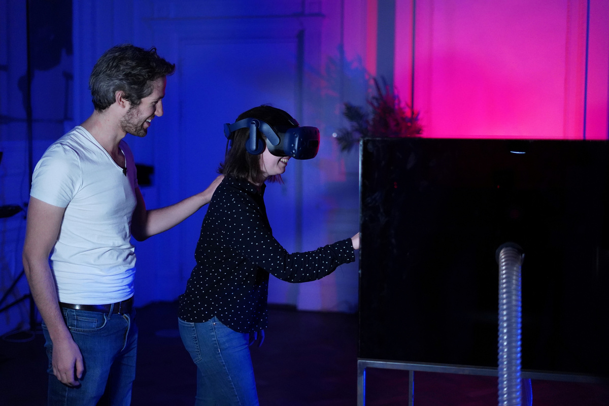 Yoni Van Den Brink stands next to his partner Sophie Van Den Brink-Fitzsimmons who uses 3D goggles to meet the cyborg baby they created as part of the "IVF-X: Become a digital parent now!" art installation by Dutch visual artist Victorine van Alphen in VondelCS Cultural Centre, Amsterdam, Netherlands, August 30, 2020. Picture taken August 30, 2020. REUTERS/Esther Verkaik