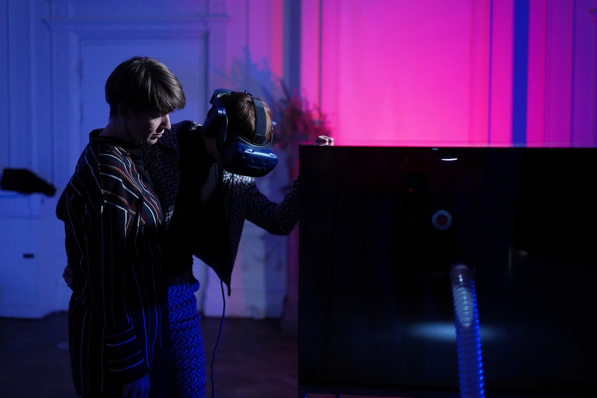 Jennifer van Exel stands next to her partner Frouke Engel who uses 3D goggles to meet the cyborg baby they created as part of the "IVF-X: Become a digital parent now!" art installation by Dutch visual artist Victorine van Alphen in VondelCS Cultural Centre, Amsterdam, Netherlands, August 30, 2020. Picture taken August 30, 2020. REUTERS/Esther Verkaik