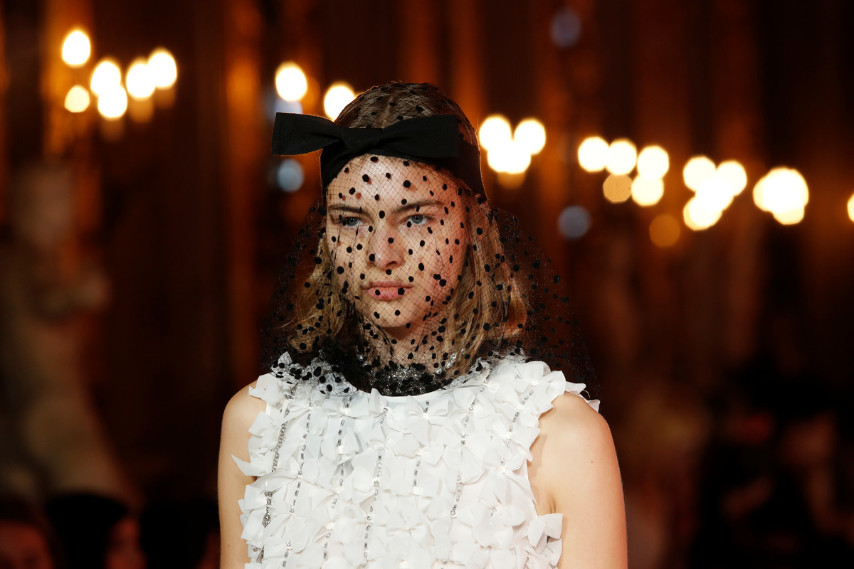 A model wears a black veiled fascinator with bow and a sleeveless white silk adorned top, at the Giambattista Valli fashion show, where the designer presented his collection created in collaboration with fast-fashion giant H&M, in Rome, Italy October 24, 2019. Picture taken October 24, 2019. REUTERS/Remo Casilli