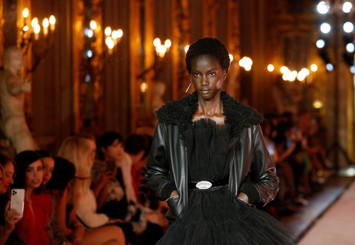 A plus-size model walks down the catwalk wearing a black tulle embroidered dress during the fashion show to present creations of designer Giambattista Valli and fast-fashion giant H&M in Rome, Italy October 24, 2019. Picture taken October 24, 2019. REUTERS/Remo Casilli