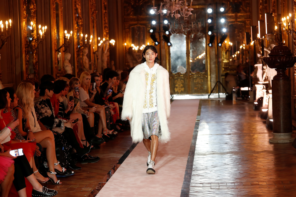 The Rome-born designer, who shows his own ready-to-wear and haute couture collections in Paris, also presented menswear creations in the collaboration, including sparkling sequined trouser suits. Male models also wore floral knits and tiger-print jackets and trousers.