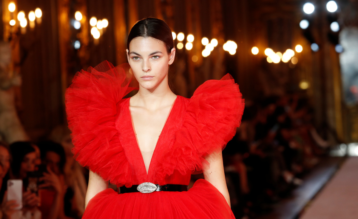 Against a backdrop of chandeliered gilded salons, models including Kendall Jenner swept down a pink catwalk in an array of feminine and glamorous gowns, a staple for Paris-based Valli, whose designs are often seen on the red carpet.