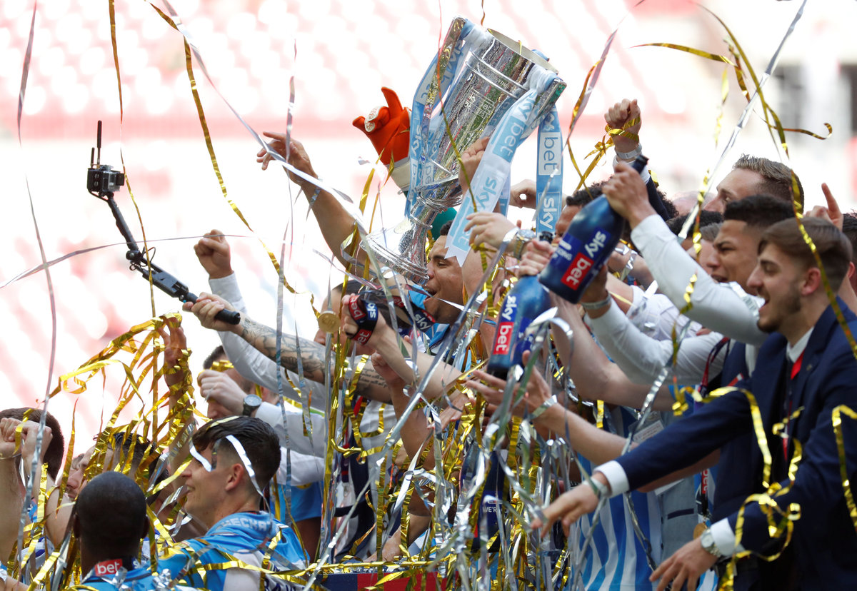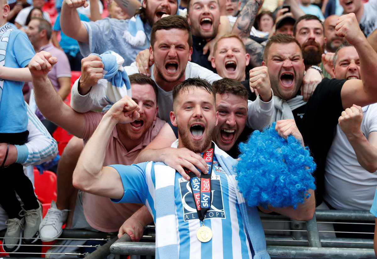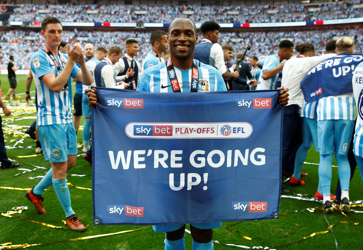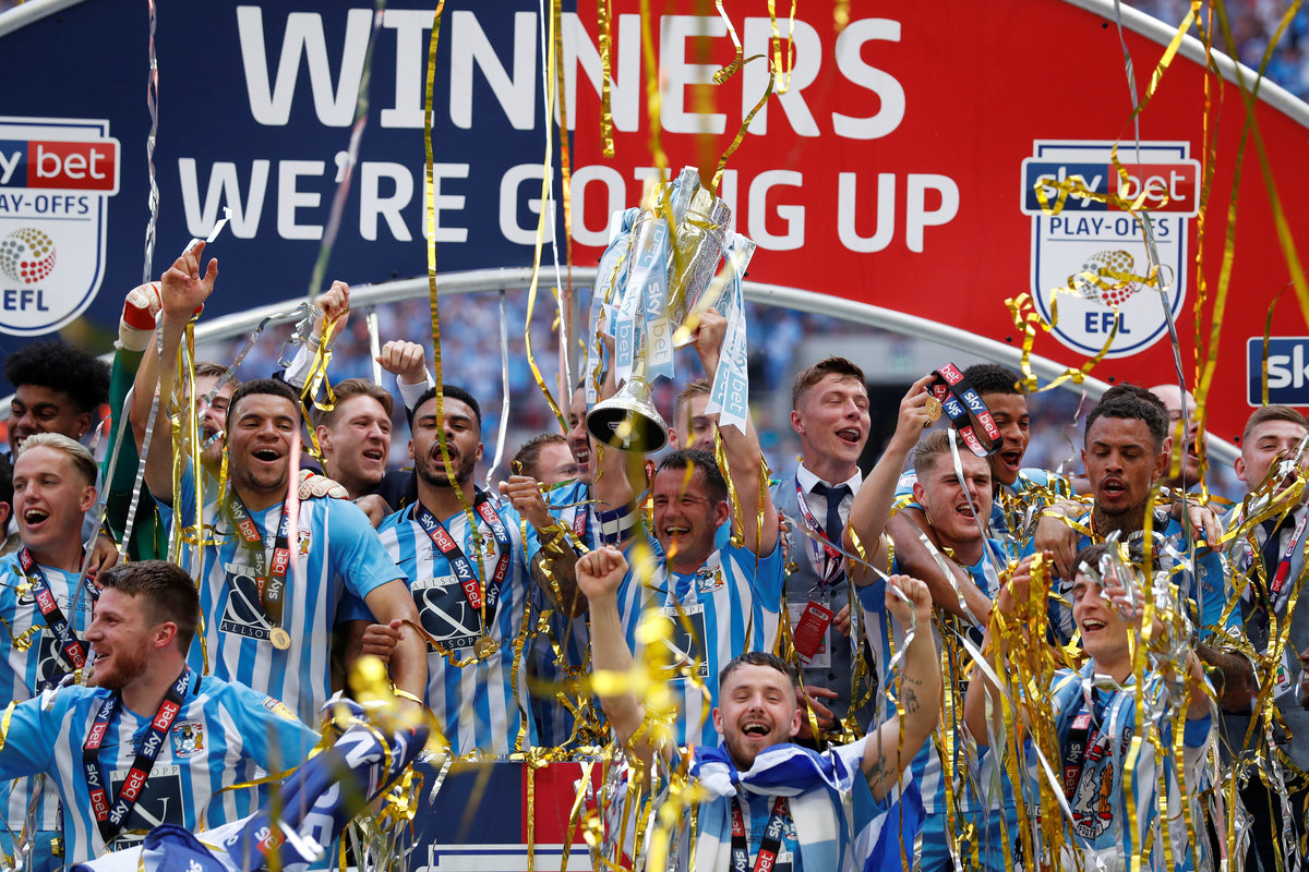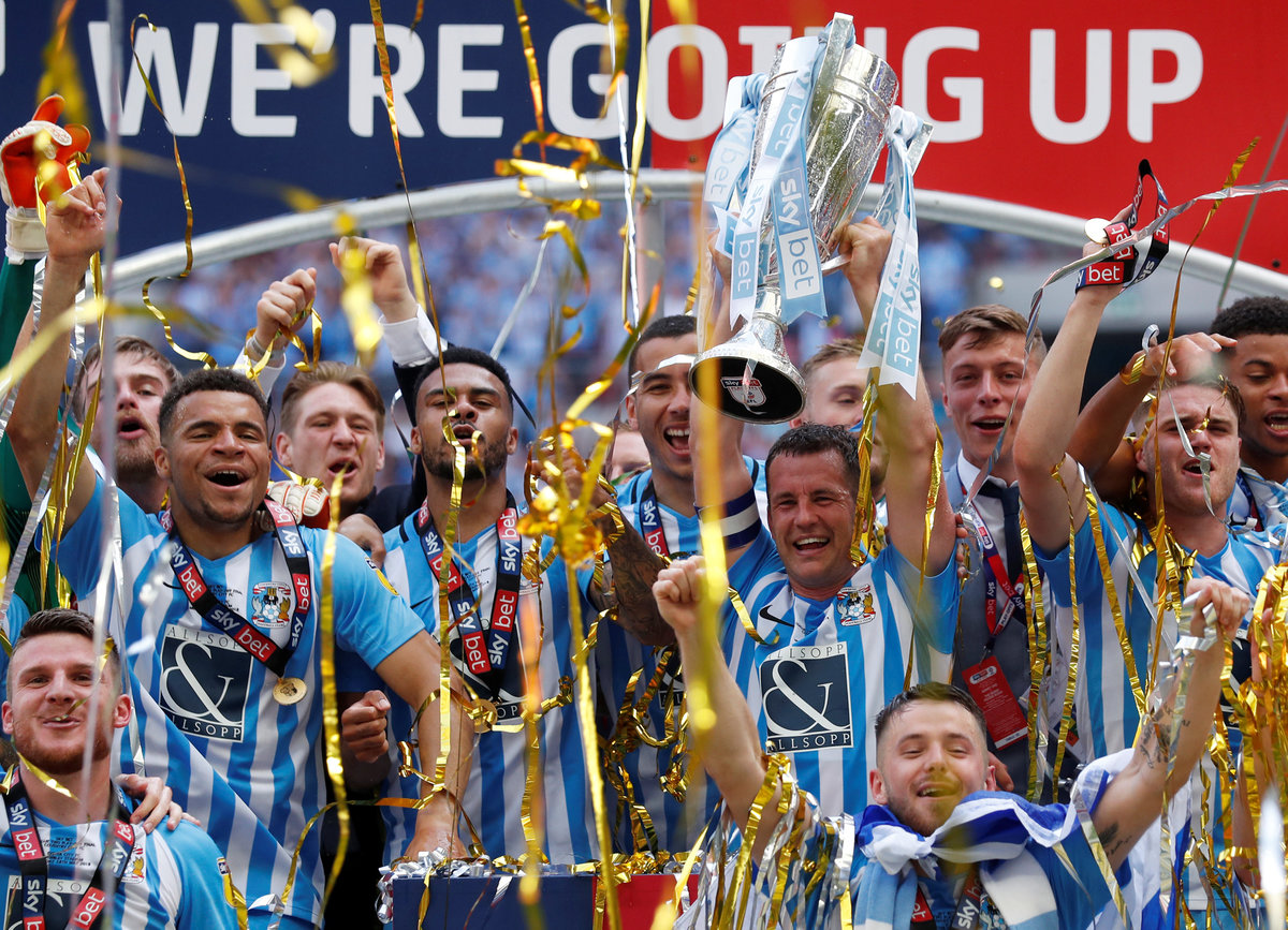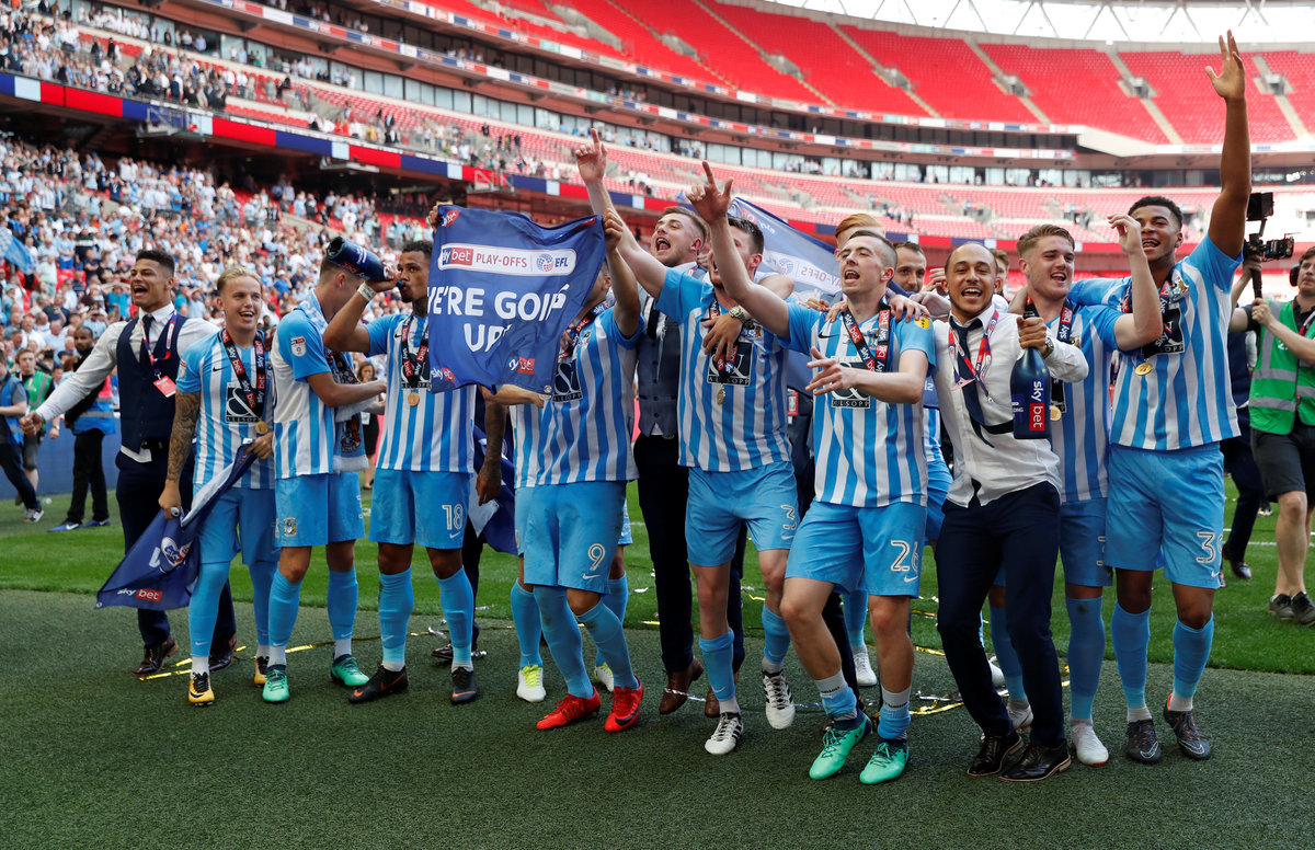 Soccer Football - League Two Play-Off Final - Exeter City vs Coventry City - Wembley Stadium, London, Britain - May 28, 2018 Coventry City celebrate with the trophy after winning the League Two Play-Off Final Action Images/Matthew Childs Soccer Football - League Two Play-Off Final - Exeter City vs Coventry City - Wembley Stadium, London, Britain - May 28, 2018 Coventry City's Marc McNulty and Maxime Biamou celebrate winning the League Two Play-Off Final Action Images/Matthew Childs Soccer Football - League Two Play-Off Final - Exeter City vs Coventry City - Wembley Stadium, London, Britain - May 28, 2018 Coventry City's Marc McNulty celebrates with fans after winning the League Two Play-Off Final Action Images/Matthew Childs Soccer Football - League Two Play-Off Final - Exeter City vs Coventry City - Wembley Stadium, London, Britain - May 28, 2018 Coventry City celebrate after winning the League Two Play-Off Final Action Images/Matthew ChildsSoccer Football - League Two Play-Off Final - Exeter City vs Coventry City - Wembley Stadium, London, Britain - May 28, 2018 Coventry City's Maxime Biamou celebrates with fans after winning the League Two Play-Off Final Action Images/Matthew Childs