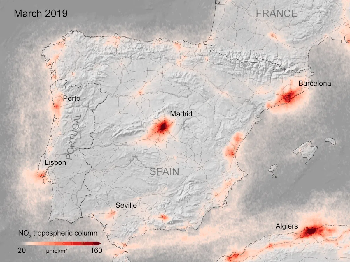 The above animation reveals the incredible reduction in levels of nitrogen dioxide above Madrid, Spain during the period of March 14-25 of this year, compared to that same period the year before. Nitrogen dioxide is one of the most abundant greenhouse gas pollutants.