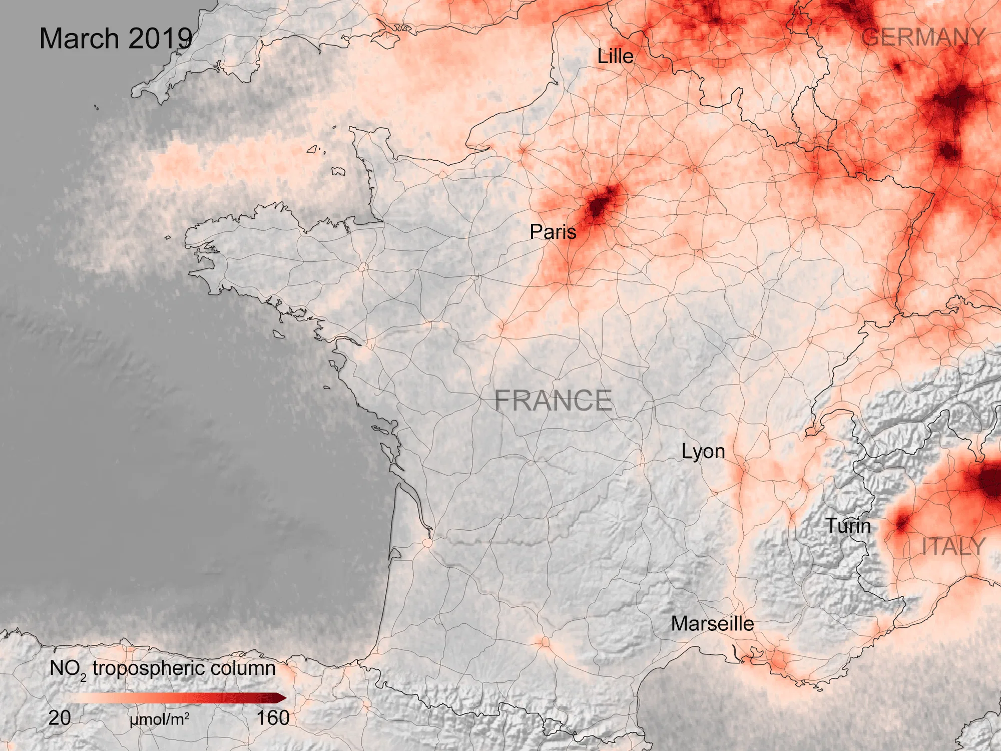 The before-and-after images shown above were put together using satellite data recorded over France during the same period, between March 14-25, 2020 and 2019.