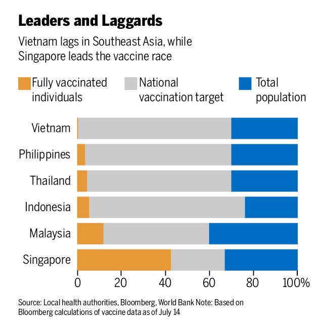 As large parts of the developed world reopen for business, the worsening situation across most of Southeast Asia means they’re reimposing growth-sapping movement curbs. Singapore is the exception, where sealed borders and high vaccination rates are keeping the virus contained in the region’s sole developed economy.