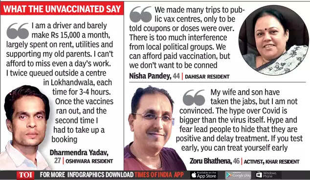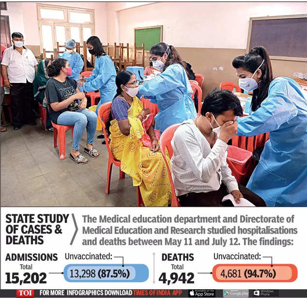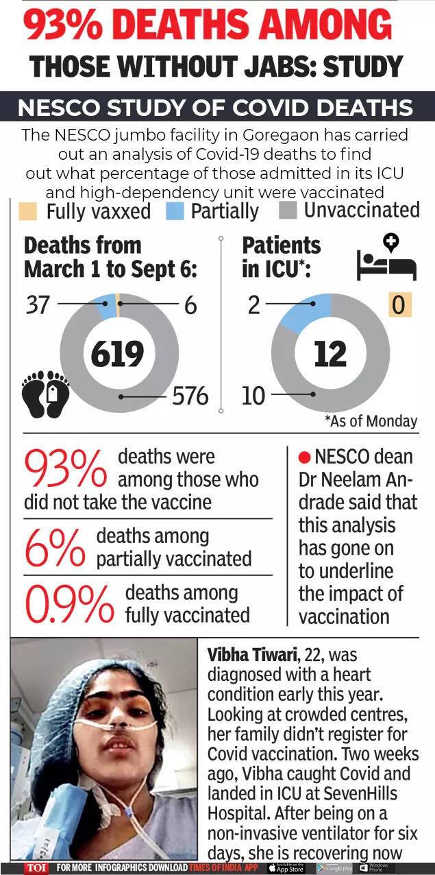 TOI spoke to families whose loved ones, mostly unimmunised, are fighting severe Covid. 68-year-old W D’Souza, who has Covid pneumonia, wasn’t keen on inoculation. Intensivist with SevenHills, Dr Viplove Jadhao, said everyone in his family had taken the shots but they couldn’t convince D’Souza to get jabbed. Abdul Aziz Ansari, husband of Nasim Bano (62), who is in the ICU at St George, said they had decided to get vaccinated on different days in case the side-effects were severe. While Ansari took a shot a month ago, Nasim hadn’t got hers when she developed Covid four days ago.