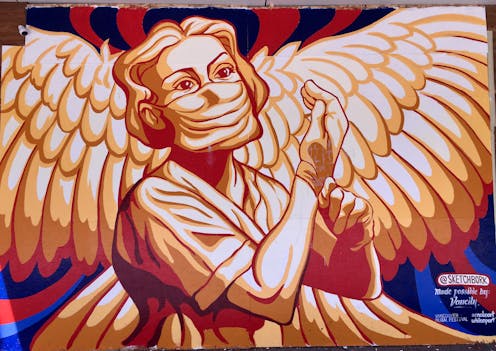 Inspirational murals, like the masked angelic health professional by Will Phillips in downtown Vancouver, represent the care and professional competence of health-care and other essential workers. These murals often contain portraits of individuals or small groups in monumental, heroic or even quasi-religious poses. They feature personal care workers who, until recently, may have been taken for granted.